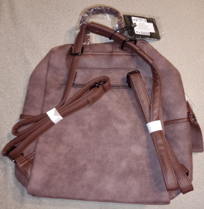 Nova ženska torba s etiketom u elegantnoj smeđoj boji, izrađena od kvalitetnog materijala. Prostrani ruksak sadrži nekoliko praktičnih džepova i podesivih naramenica za udobno nošenje.