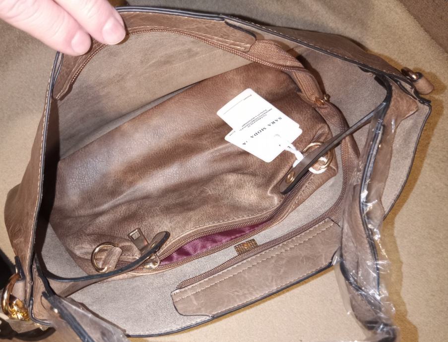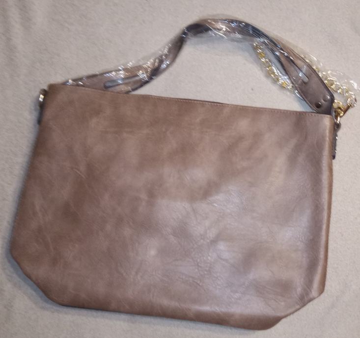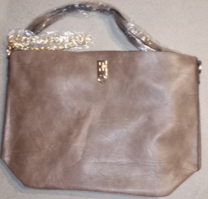 Elegantna ženska torba u bež boji s dekorativnim zlatnim detaljima i lancem, potpuno nova s etiketom. Prostrana unutrašnjost nudi dovoljno mjesta za sve vaše potrebe, dok kombinacija ručke i lanca omogućava različite načine nošenja.