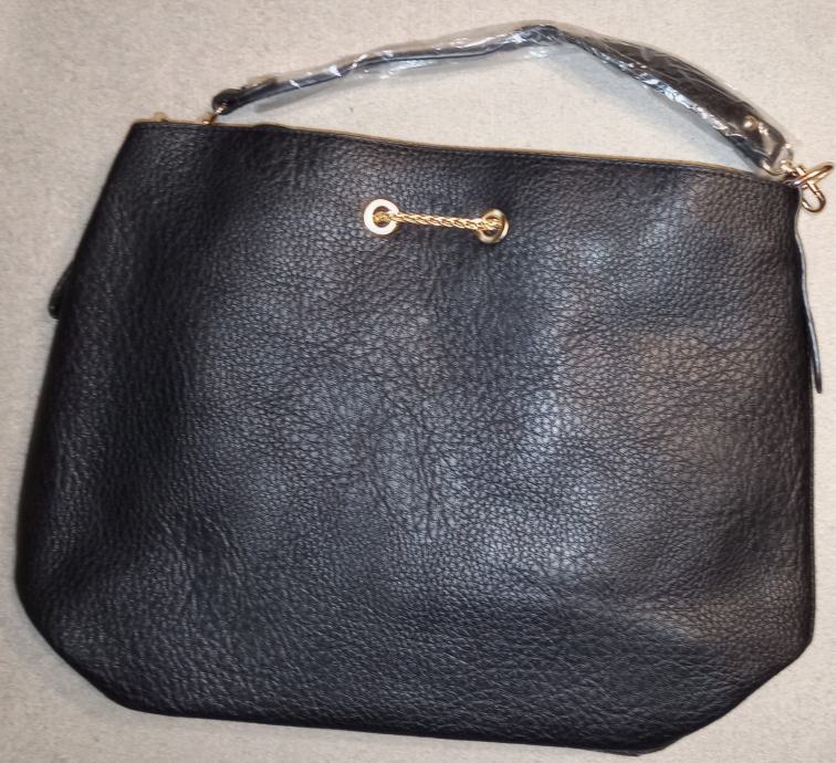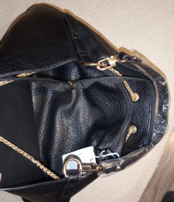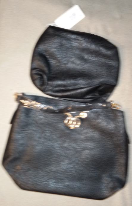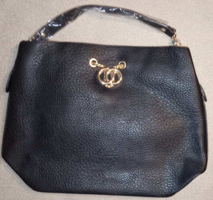 Elegantna ženska torba od kvalitetne crne kože s dekorativnim zlatnim detaljima, potpuno nova s etiketom. Prostrana unutrašnjost pruža dovoljno mjesta za sve vaše svakodnevne potrepštine, a moderan dizajn savršeno će nadopuniti svaki outfit.