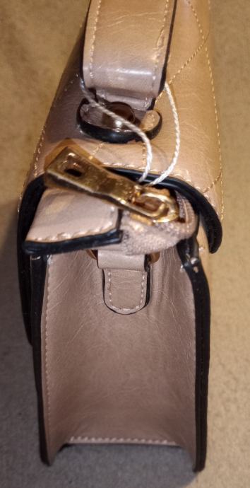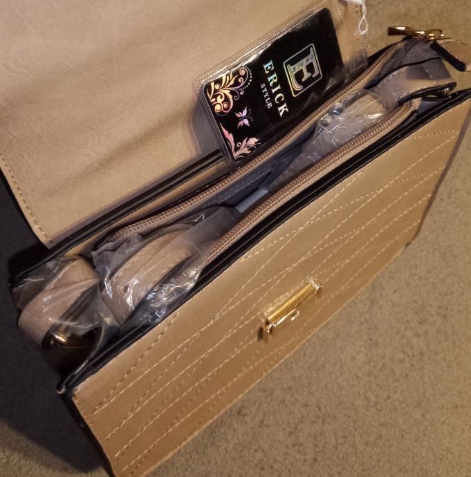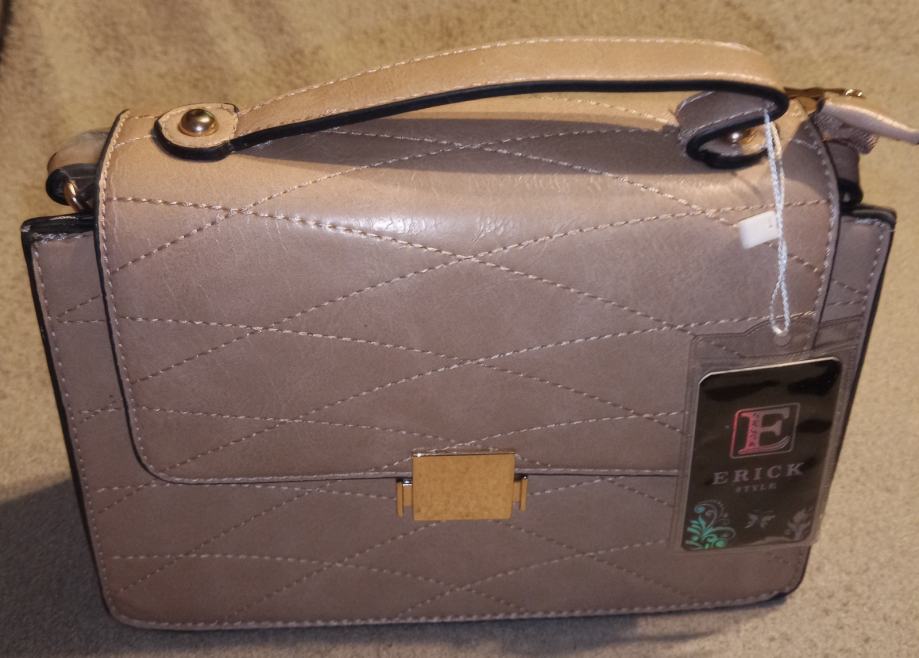 Elegantna ženska torba brenda ERICK u bež boji s ukrasnim prošivima i zlatnim detaljima, potpuno nova s etiketom. Torba ima praktičan pretinac i dolazi s originalnom zaštitnom ambalažom. Savršen modni dodatak za svaku priliku, s modernim dizajnom i kvalitetnom izradom.