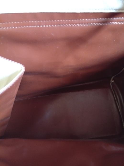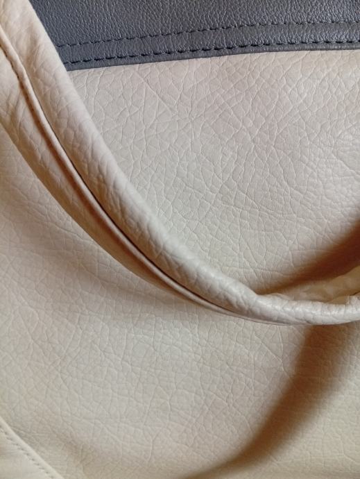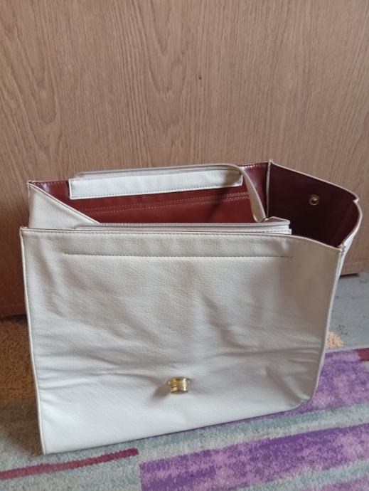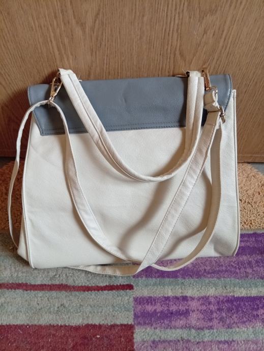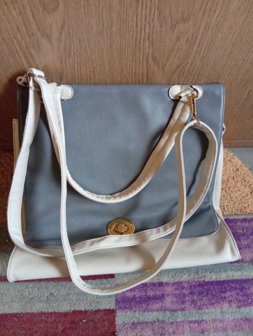 Prodajem žensku torbu u kombinaciji sivo-plave i krem boje s zlatnim detaljima. Torba ima preklopni dizajn s okruglim zlatnim kopčanjem na preklop, kao i podesivi ремен za nošenje preko ramena. Unutrašnjost je u bordo crvenoj boji. Torba je novog stanja, bez etikete.