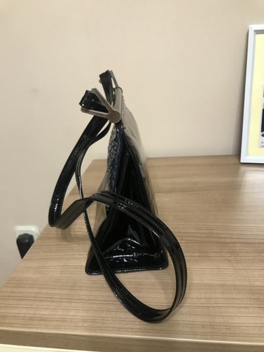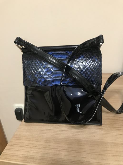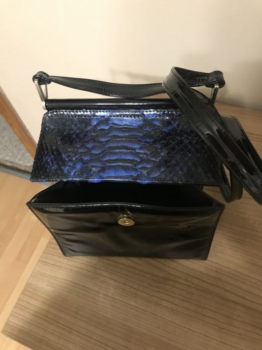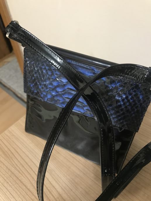 Prodajem žensku kožnu lakiranu večernju torbicu u tamnoplavoj boji, s aplikacijom izgleda krokodilske kože. Torbica je nošena par puta i nema znakova nošenja, kao nova!