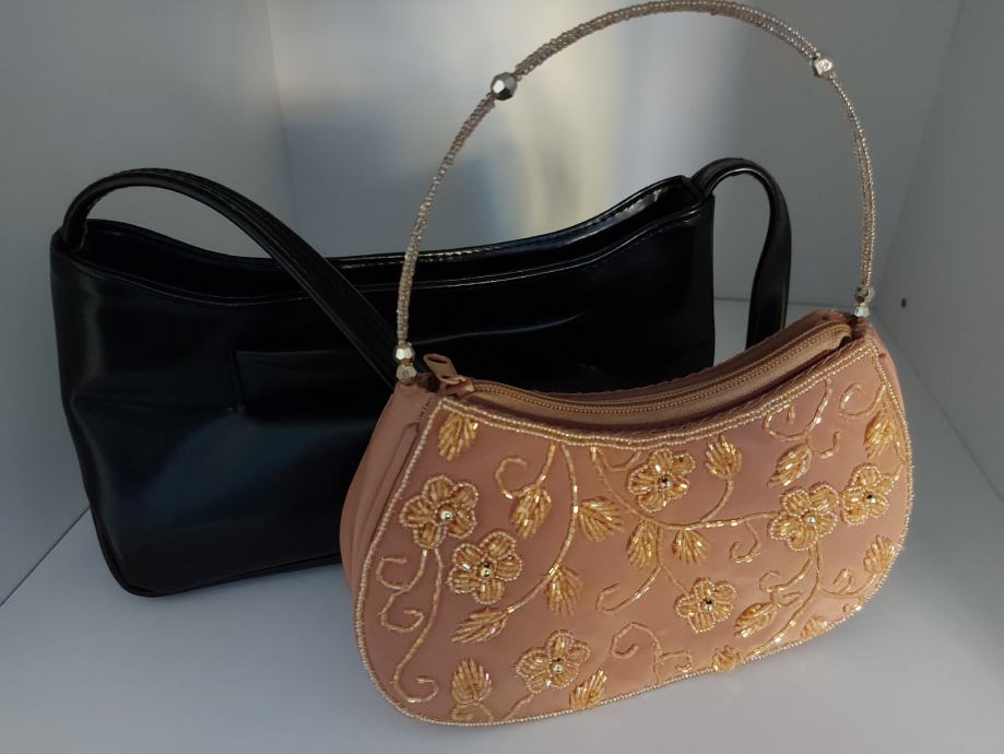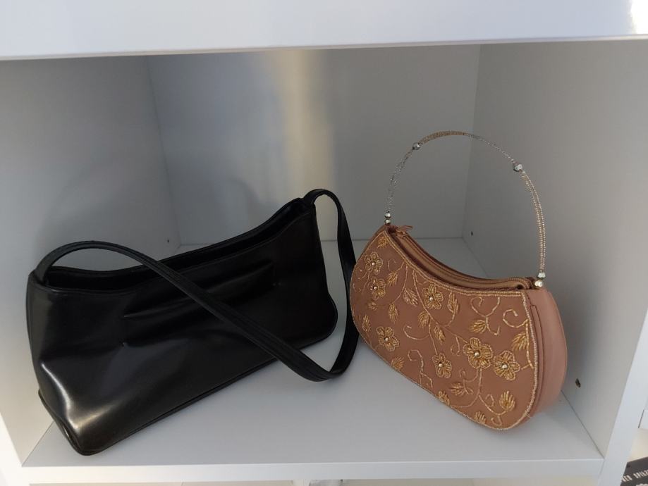 Dvije male ženske torbice; crna nošena svega dva-tri puta, druga nijednom. Neoštećene i lijepe, kao nove. Male, a funkcionalne i prostrane.