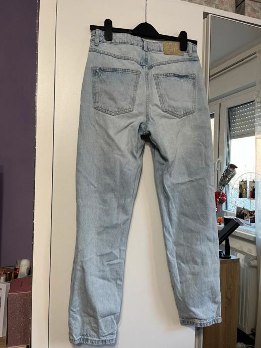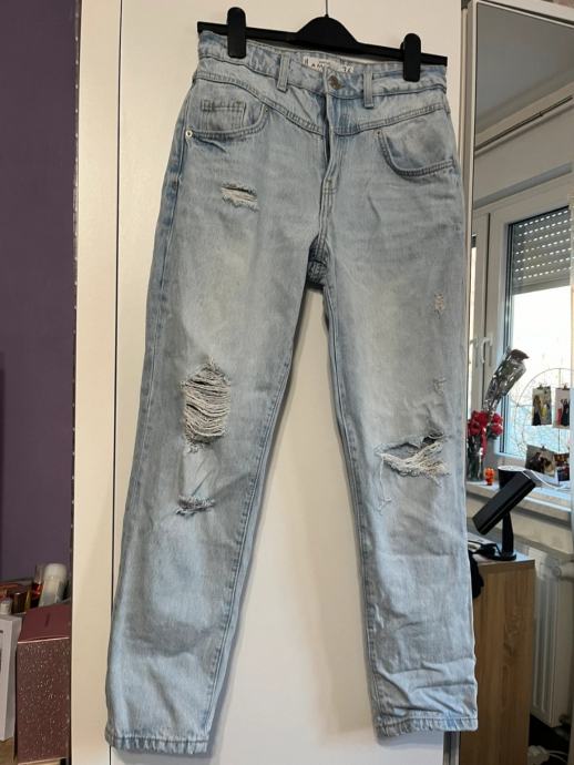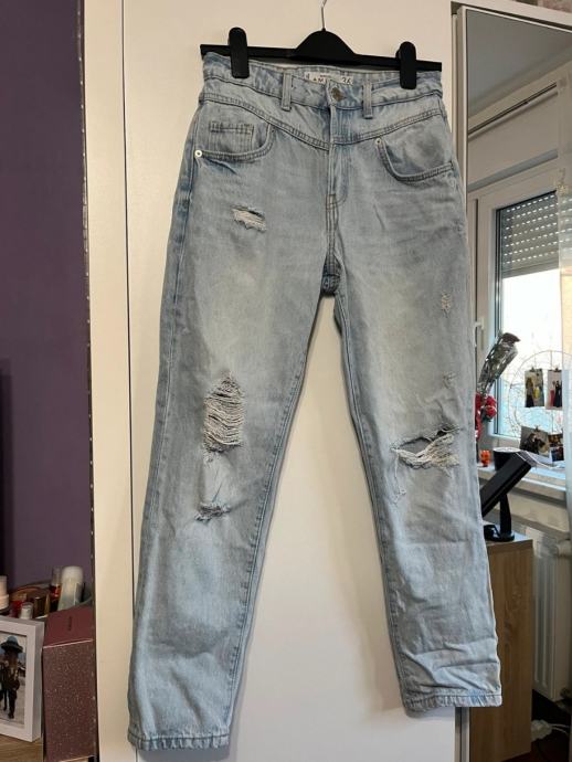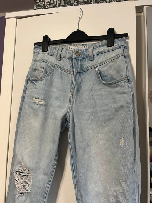 Prodajem Amisu traperice u veličini 36. Svijetloplave su boje s efektom izbjeljivanja i ukrašene su karakterističnim potrganim detaljima na nogavicama. Kroj je ravniji, s visokim strukom i standardnom dužinom nogavica.