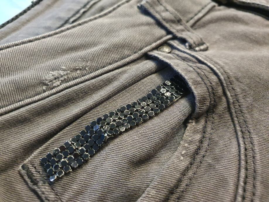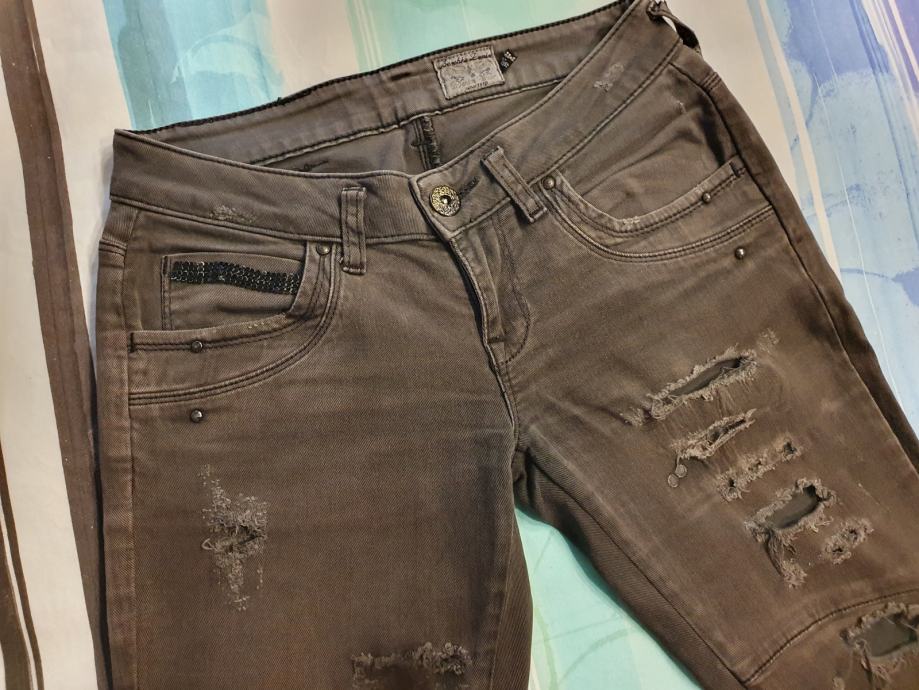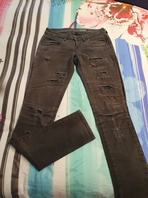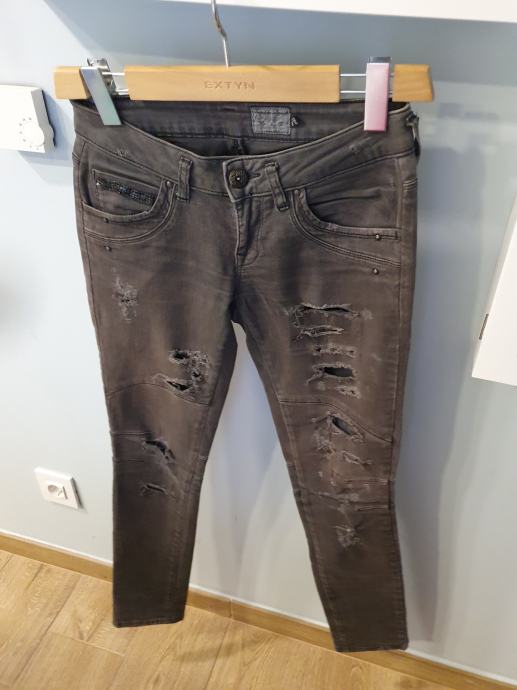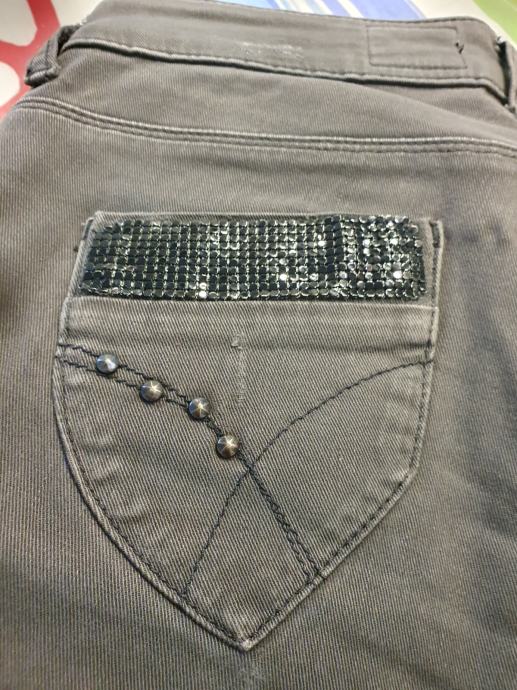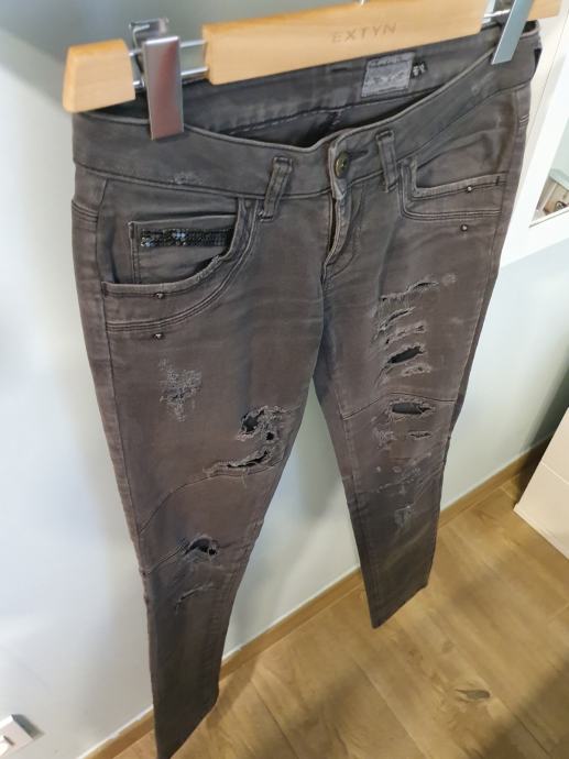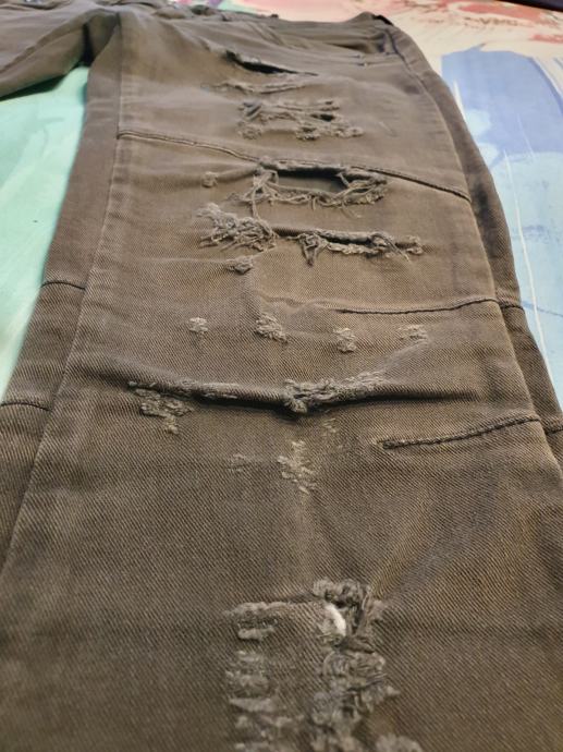 Bershka traperice tamno sive, isprane, poderane, imaju lijepe detalje na stražnjem dijelu na džepovima, uži model, elastične.