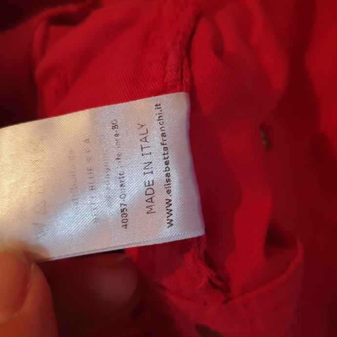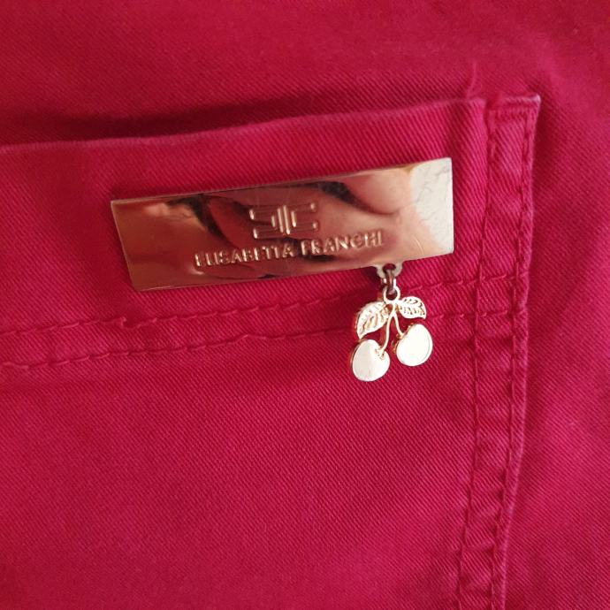 Traperice boje višnje Elizabeta Franchi veličina 29. Mjere su struk 38 cm, dubina 22 cm, bokovi 49 cm, dužina 111 cm, dužina iznutra 88 cm. Sastav je 98 % pamuk 2 % elastin.