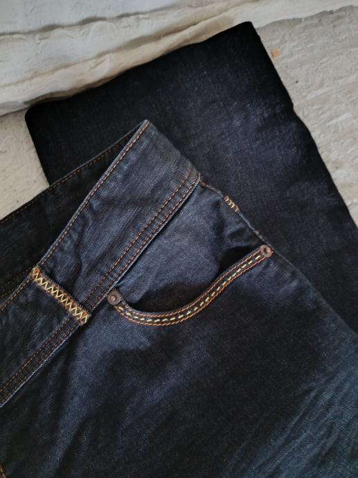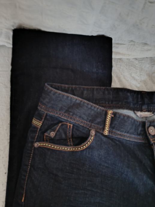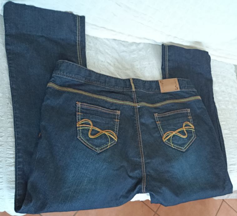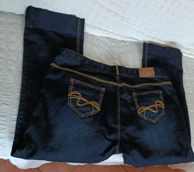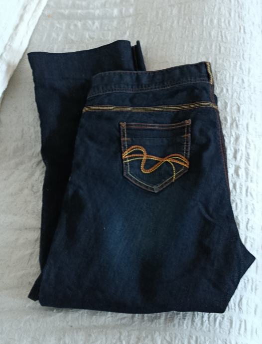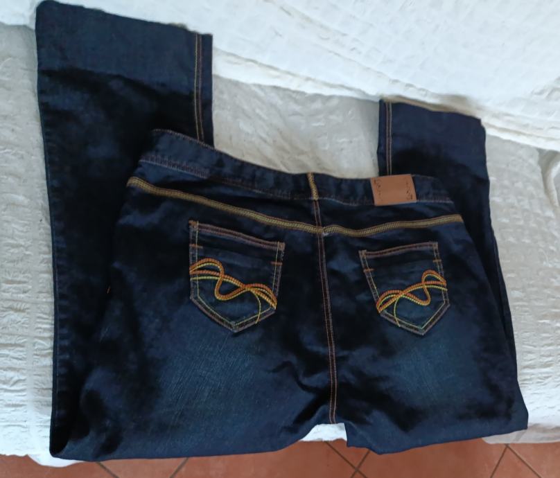 Tamnoplave ženske traperice s kontrastnim, naglašenim "vintage" prošivima (šavovima) i specifičnim dizajnom džepova. Bootcut kroja i veličina 48. Kratko korištene i nogavice su podvrnute na moju visinu. Dakle, nisu odrezane nego podvrnute naunutra i prošivene, što znači da se šav može odšiti. Stanje jako dobro.