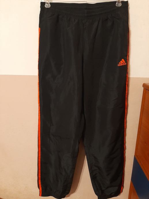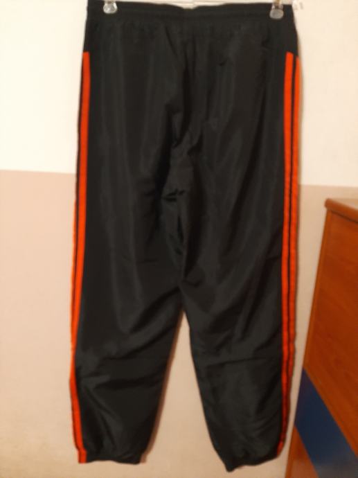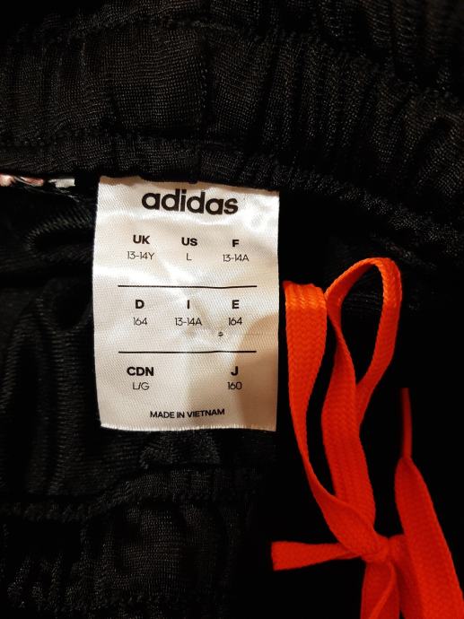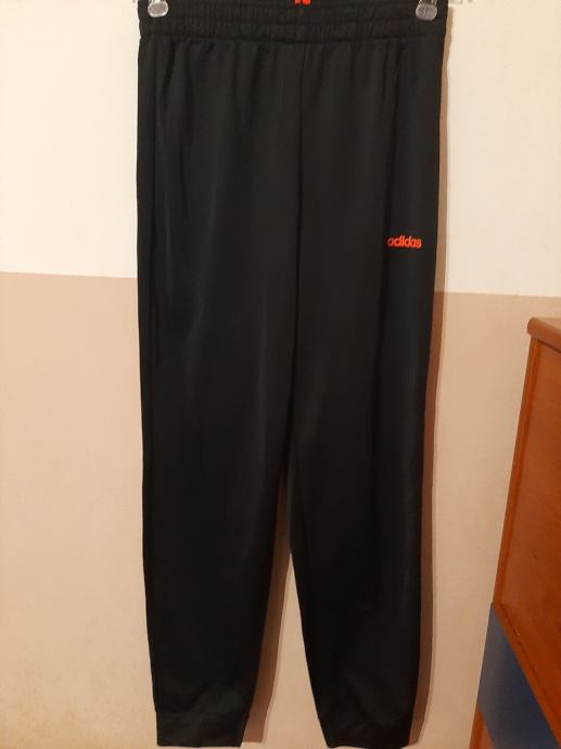 Crni ženski donji dio trenirke Adidas. Nošen kratko, kao nova. Piše da je dječja, ali ide na vel. 38-40 ovisno tko kako želi komotnost trenirke. Dužina od vrha pasice do dolje 101cm, međunožje 77cm, širina u bokovima 51cm.