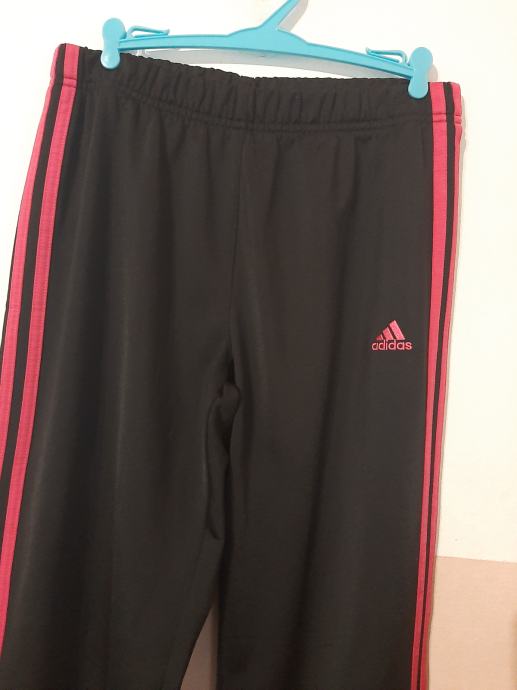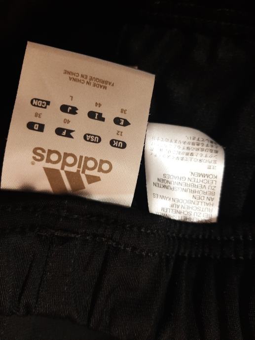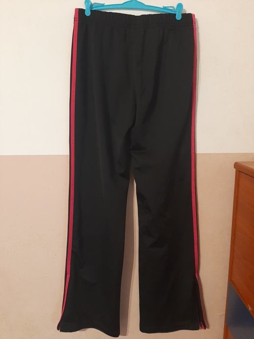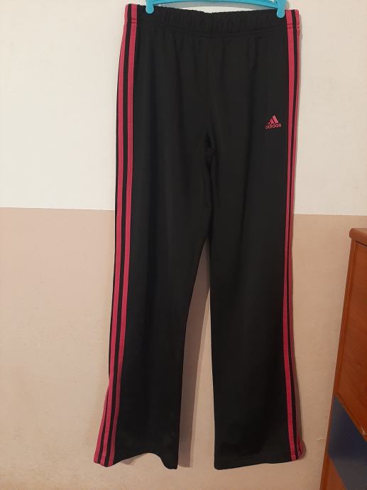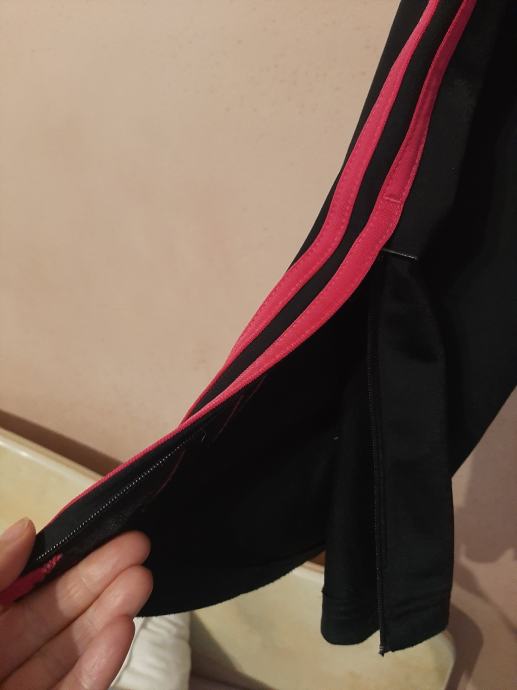 Ženski donji dio trenirke Adidas. Široke nogavice. Nošene kratko. Na kraju nogavica zatvarači. Vel. 38. Dužina od vrha pasice do dolje 101cm, dužina međunožja 81cm, širina nogavice dolje 23cm