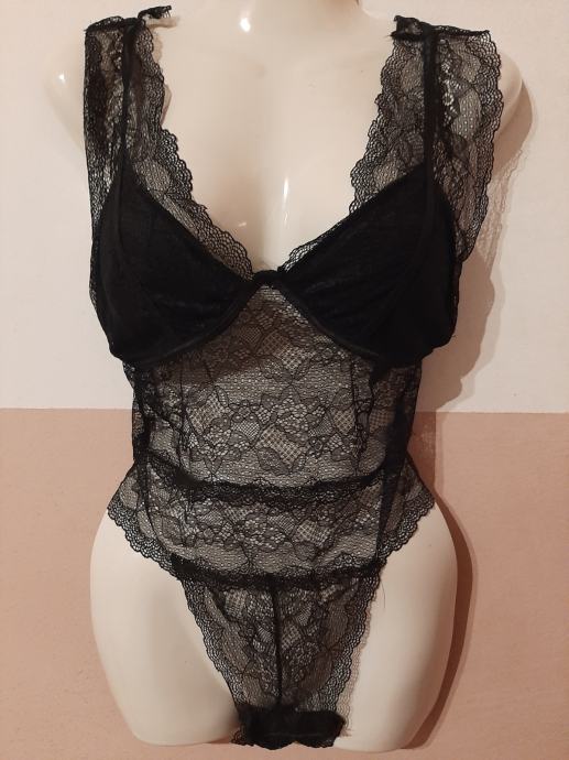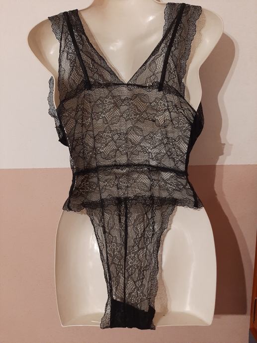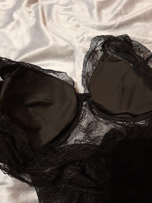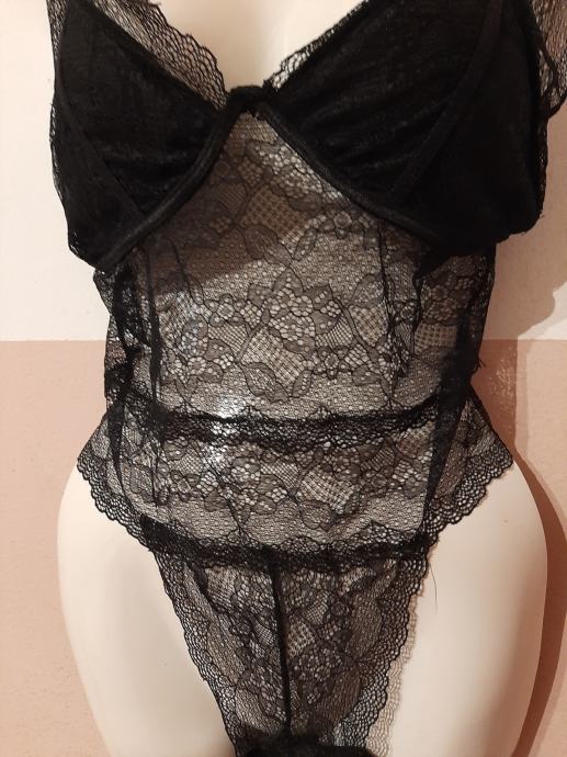 Prekrasni sav od čipke crni ženski body. Nošeni samo jednom, ali mi ne odgovara veličina. Košarice podstavljene s umecima koji se mogu skinuti. Vel. 40