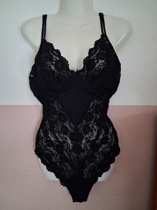 Prekrasni ženski body crne boje u kombinaciji s čipkom. Košarice od čipke s žicom. Nošen kratko. Vel. 90D