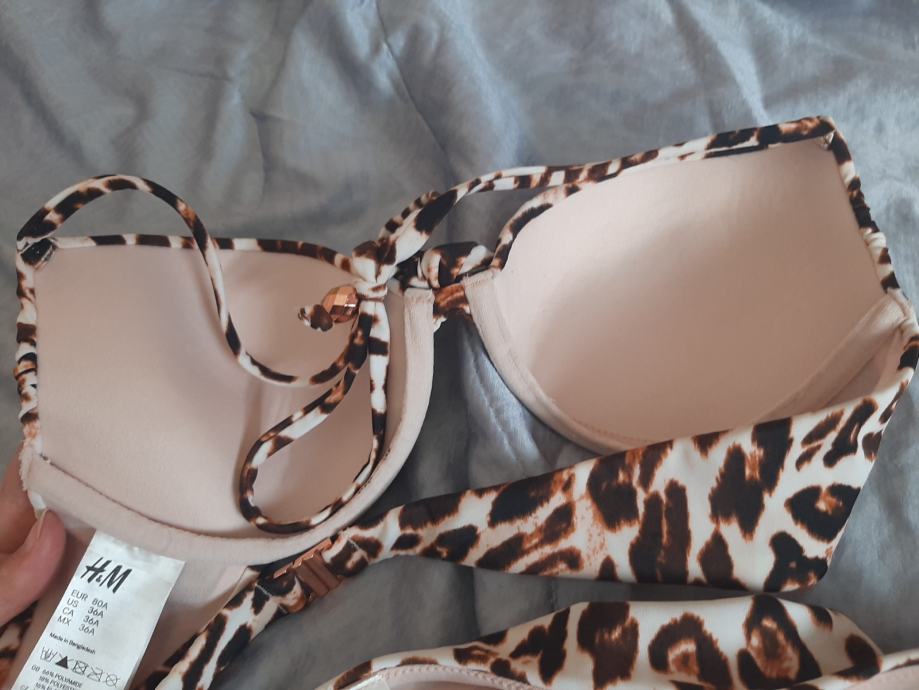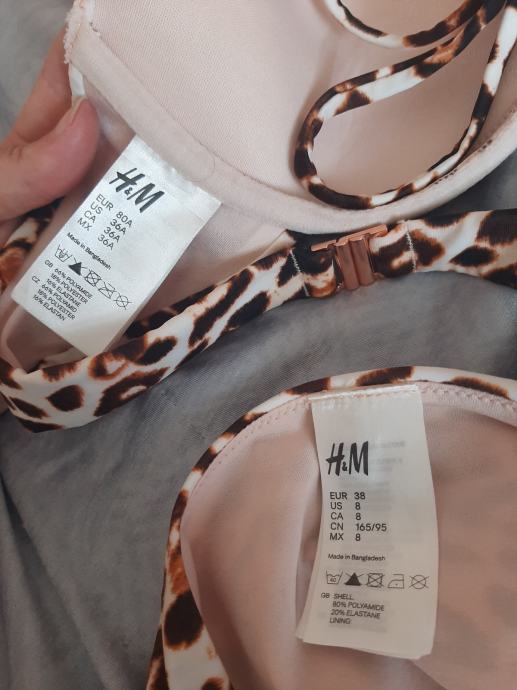 Ženski dvodjelni kupaći kostim H&M. Jednom obućeni, kao novi. Košarice lagano podstavljene. Vel. gaćica 38, grudnjak piše 80A, ali ipak su košarice B