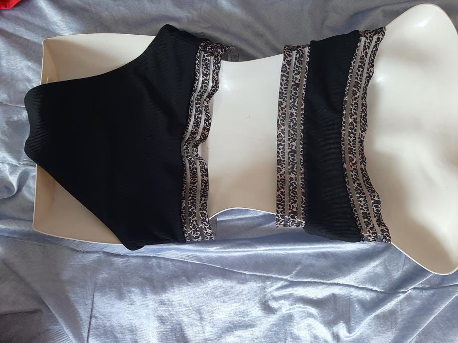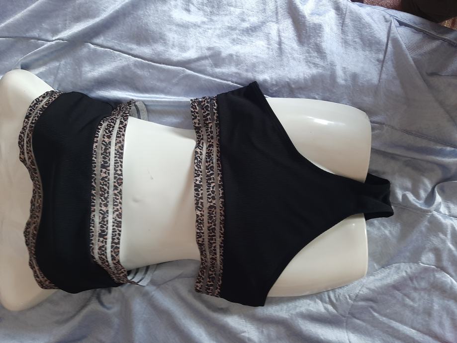 Potpuno novi, nikad nošeni ženski dvodjelni kupaći kostim. Gaće visokog struka, gornji dio kao topić s umecima koji se mogu skinuti. Vel. 38