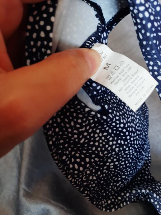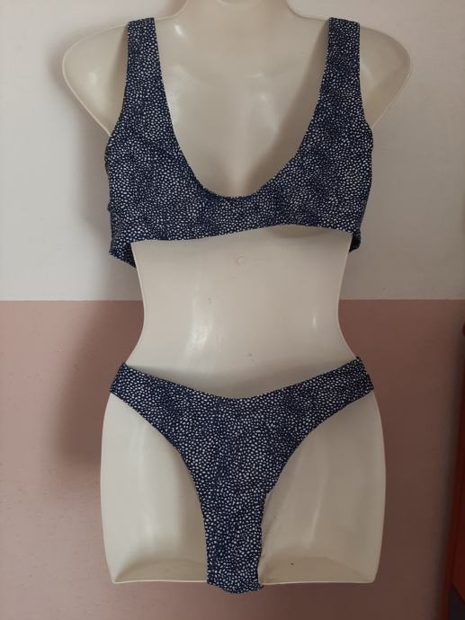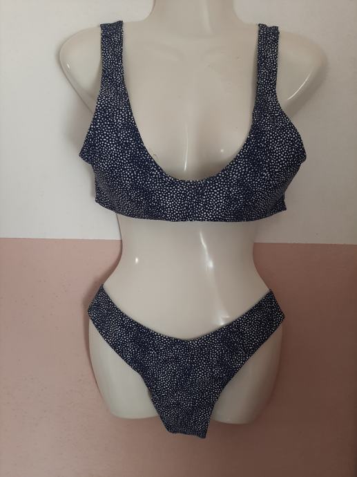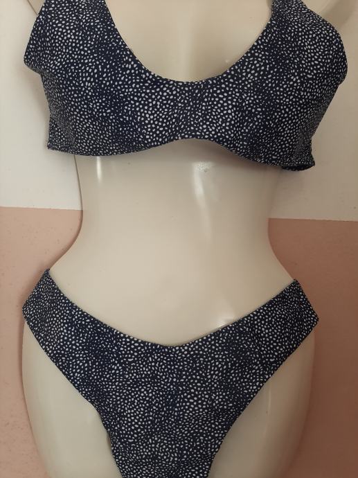 Tamnoplavi s bijelom točkicama ženski dvodjelni kupaći kostim. Nošeni svega par puta. Kao novi. Košarice podstavljene s umecima koji se mogu izvaditi. Vel. 38