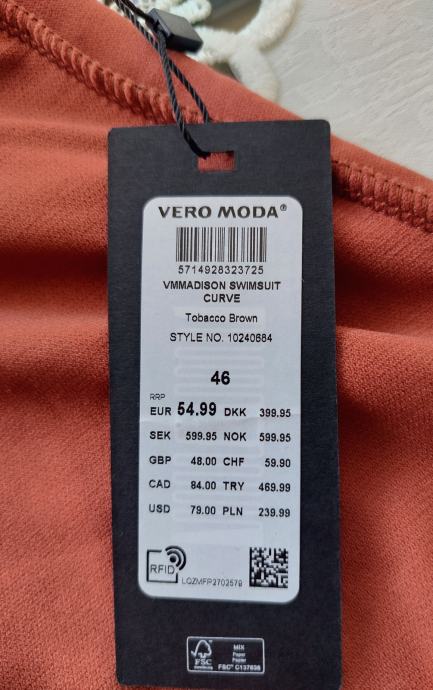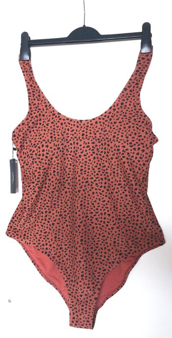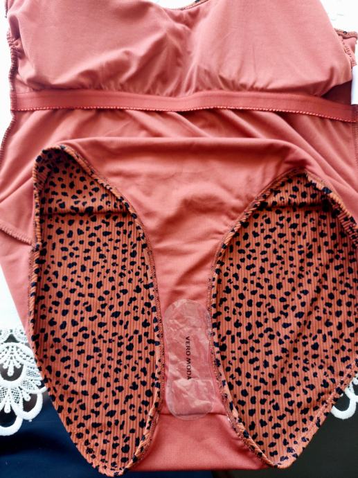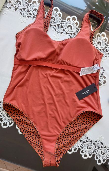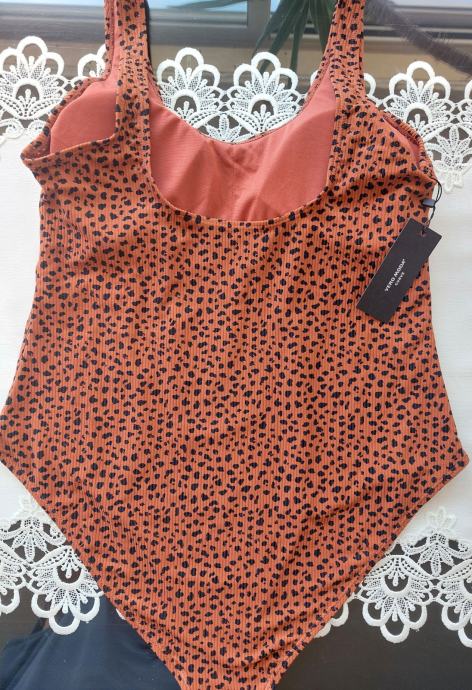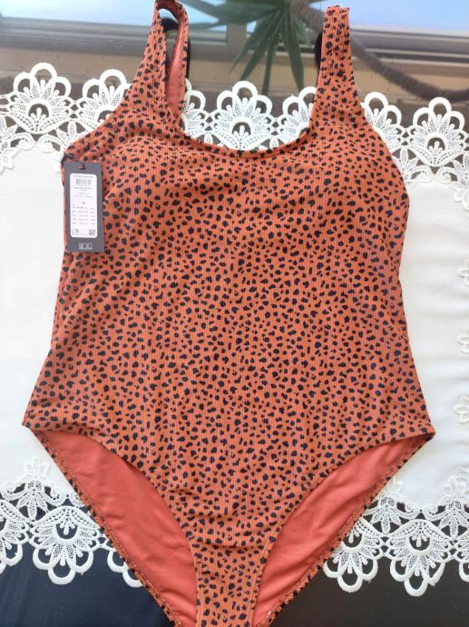 Zbog neodgovarajuće veličine, prodajem novi novcati jednodijelni ženski kupaći kostim. Kostim je smeđe boje, lijepa zlatasta tobacco nijansa, s crnim uzorkom, veličine 46, podstavljen i s integriranim košaricama (vidi fotografije).
