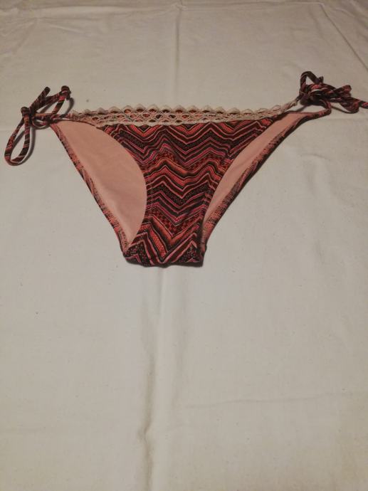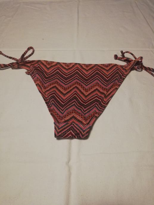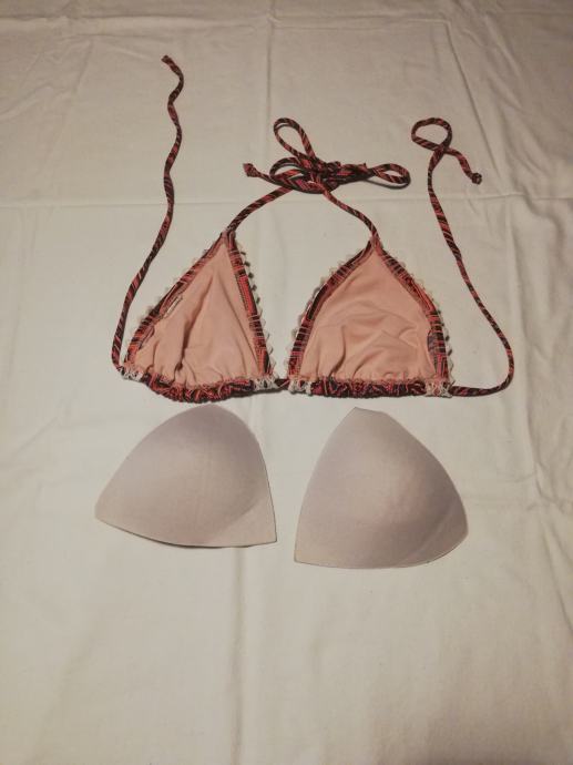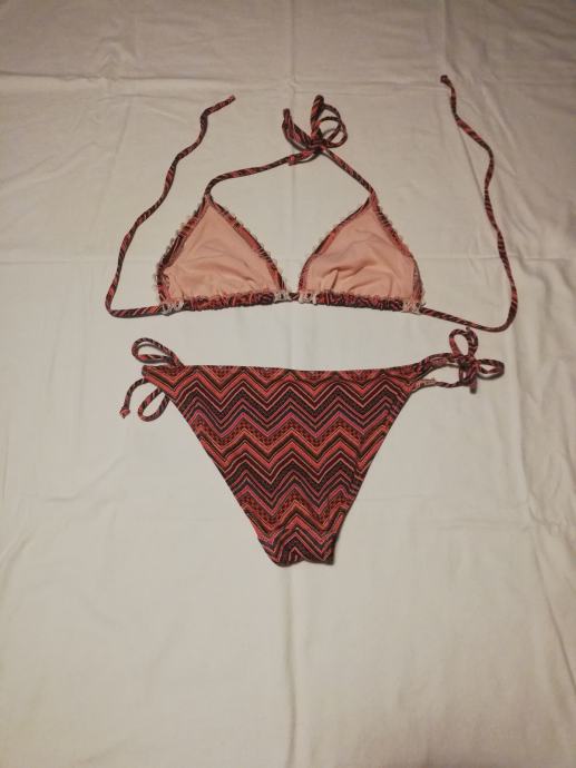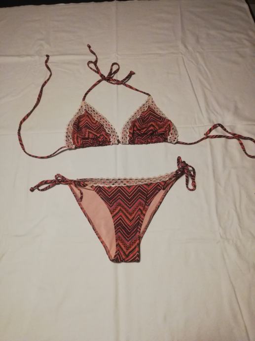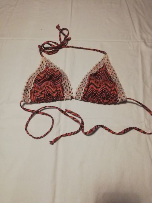 Šareni bikini s uzorkom čipke po obrubu. Na vezanje je pa je veličina prilagodljiva, otprilike je M/L. U gornji dio se mogu staviti umetci koji se vide na zadnjoj slici. U Zagrebu i Karlovcu moguća je primopredaja. Pogledajte i ostale moje oglase, na više kupljenih stvari popust.