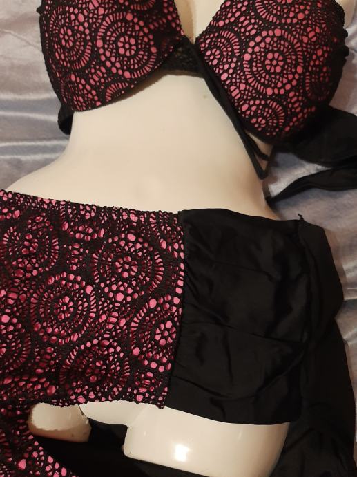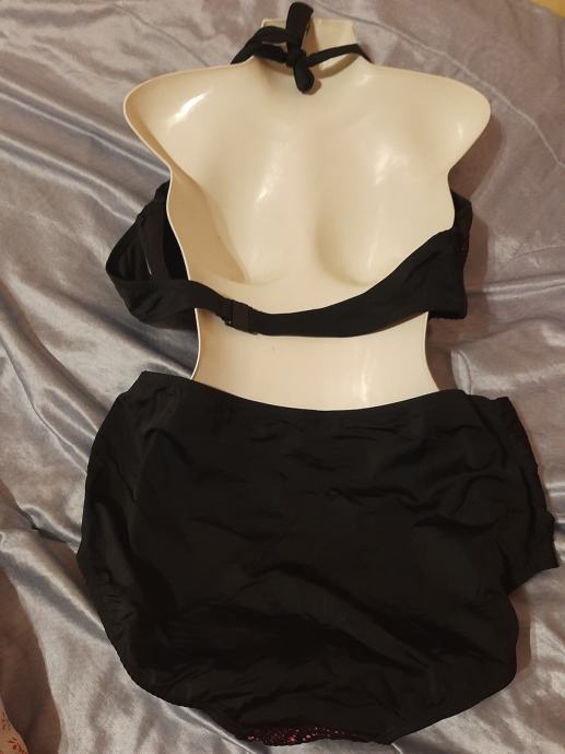 Ženski dvodjelni kupaći kostim. Nošen svega par puta, kao novi. Vrlo lijepog dizajna, kvalitetan. Gačice visoki struk, širok u bokovima, košarice lagano podstavljene vel. 5. Vel. 48