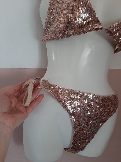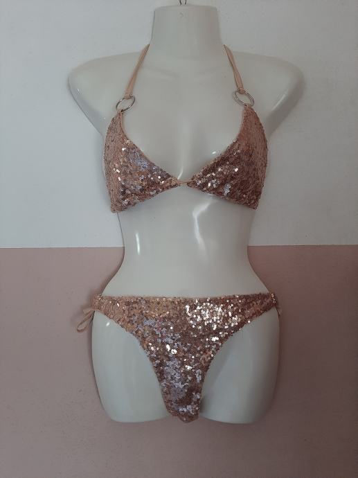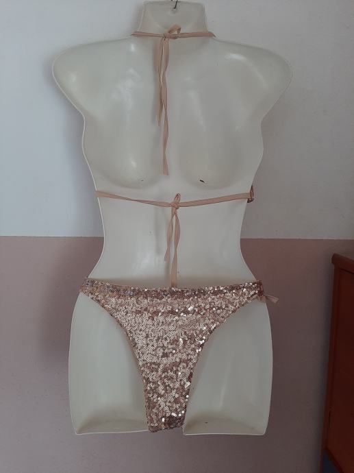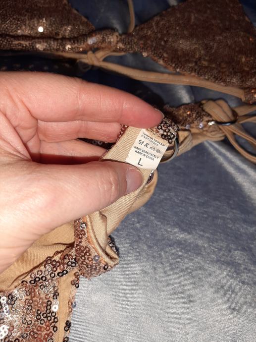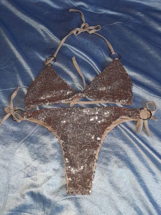Jednom obućeni dvodjelni kupaći kostim zlatni s šljokicama. Jako lijepo stoji. Piše vel. L ali je ipak M