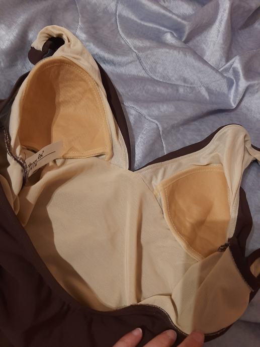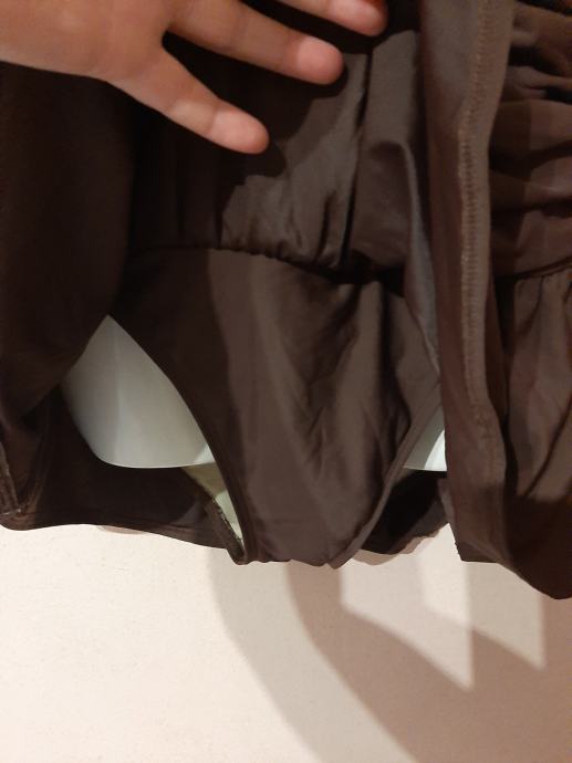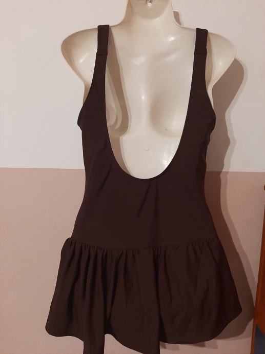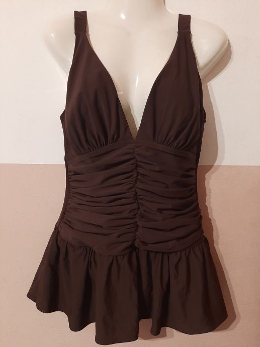Prekrasni smeđi jednodjelni kupaći kostim - haljina. Kostim je jednom obućeni, kao novi. Sa naborima koji prekrivaju eventualno nedostatke. Košarice lagano podstavljene. Vel. 40