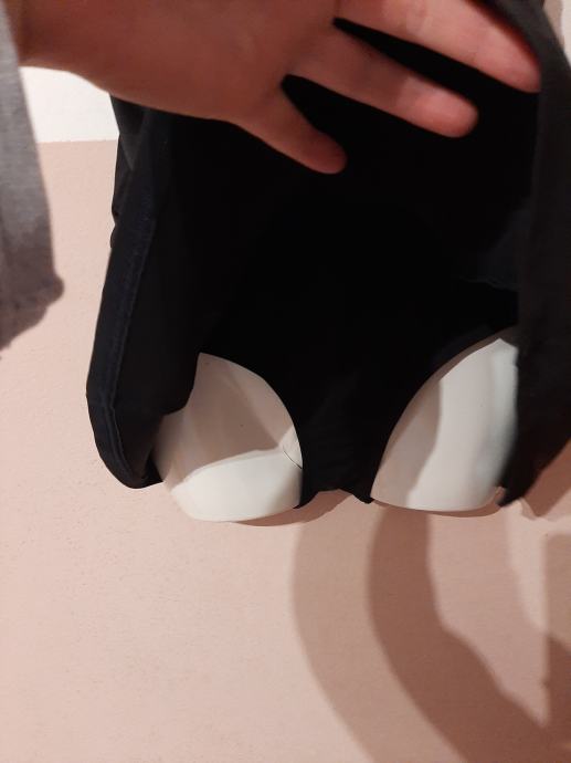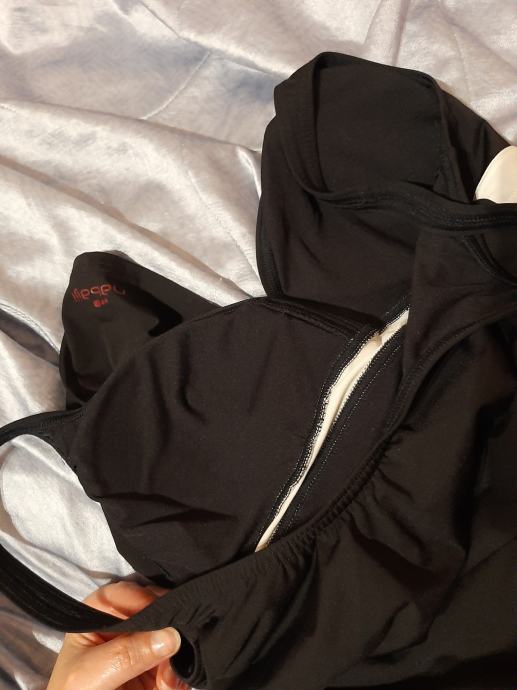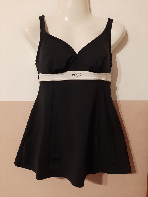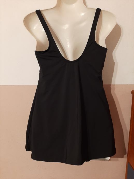 Ženski crni kupaći kostim kao haljina s gaćicama koje su prešivene zajedno kao jednodjelni kupaći. Košarice lagano podstavljene. Nošen svega par puta. Kao novi. Vel. 46-50