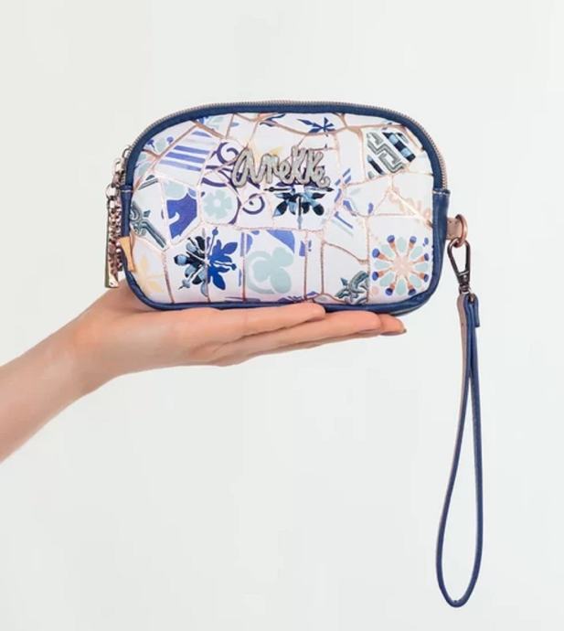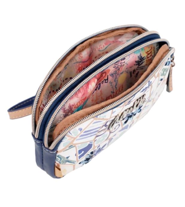 Ovaj novčanik dio je kolekcije Anekke Mediterranean Sunrise, posvećene mediteranskoj kulturi i arhitekturi. Projekt se odnosi na mozaik trencadis od fragmenata lomljene keramike, koji je, između ostalog, korišten u nacrtima poznatog španjolskog arhitekta Antonija Gaudija. To je veliki novčanik s dvostrukim pretincima i otvorima na patent zatvarač. Također dolazi s remenom za ručni zglob. A ono što nije moglo nedostajati su detalji koji ovaj model čine jedinstvenim. Od metalnih logotipa, pribadača, ukrasnih zakrpa, personaliziranih patentnih zatvarača, beskrajnih sitnih naglasaka u koje ćete se zaljubiti. Vrsta zatvaranja: patentni zatvarač Džepovi: 2 pretinca, 1 stražnji džep Vrsta ručke: ručna ručka Dimenzije (D x V x Š): 18/12/3 cm Unutarnji sastav: 100% poliester Vanjski sastav: 100% PU Težina: 0,15 kg