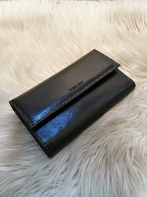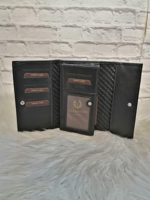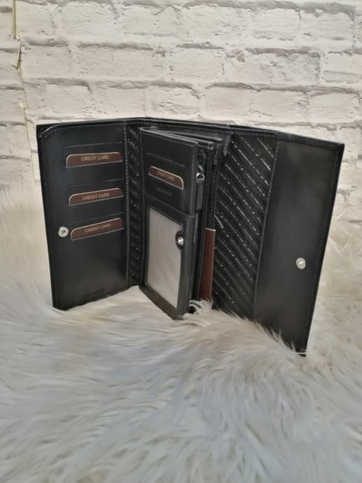Novčanik se sastoji od 9 pretinaca za kartice,3 pretinca za novčanice,2 pretinca za dokumente, pretinca za kovanice,1 prozirni pretinca,sa stražnje strane novčanika nalazi se džep.