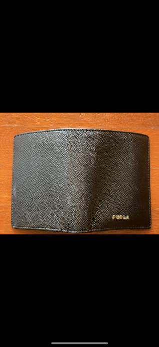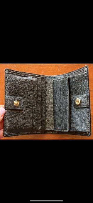 Furla mali novčanik crne boje, s zlatnim slovima. Dimenzije cca 8cm x 11,5cm.