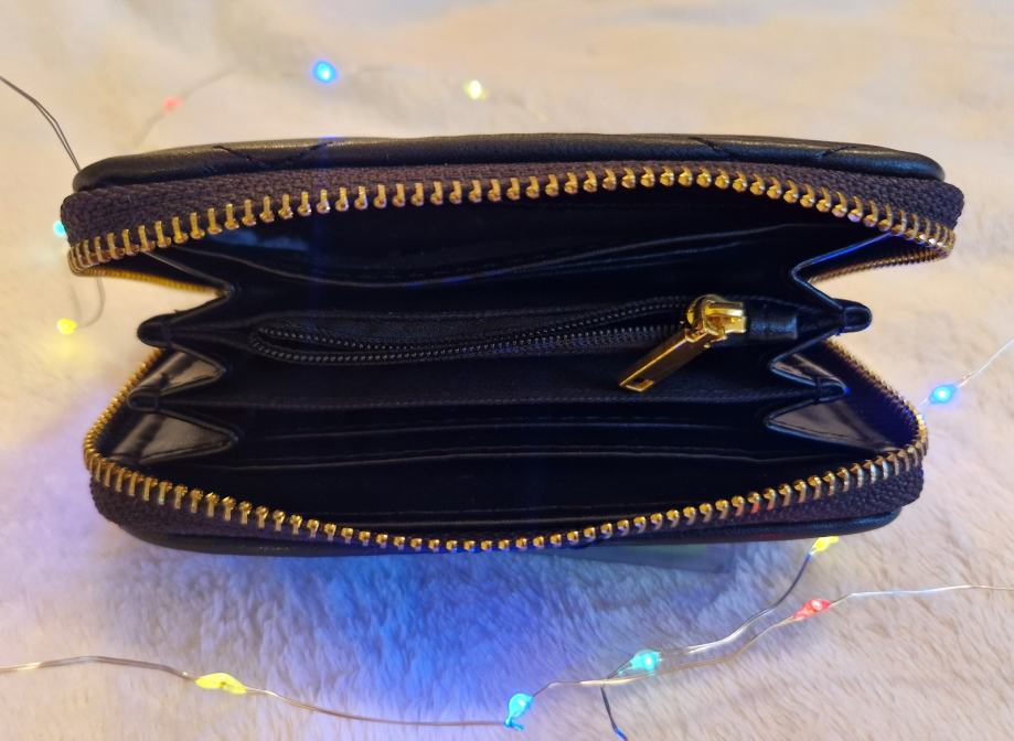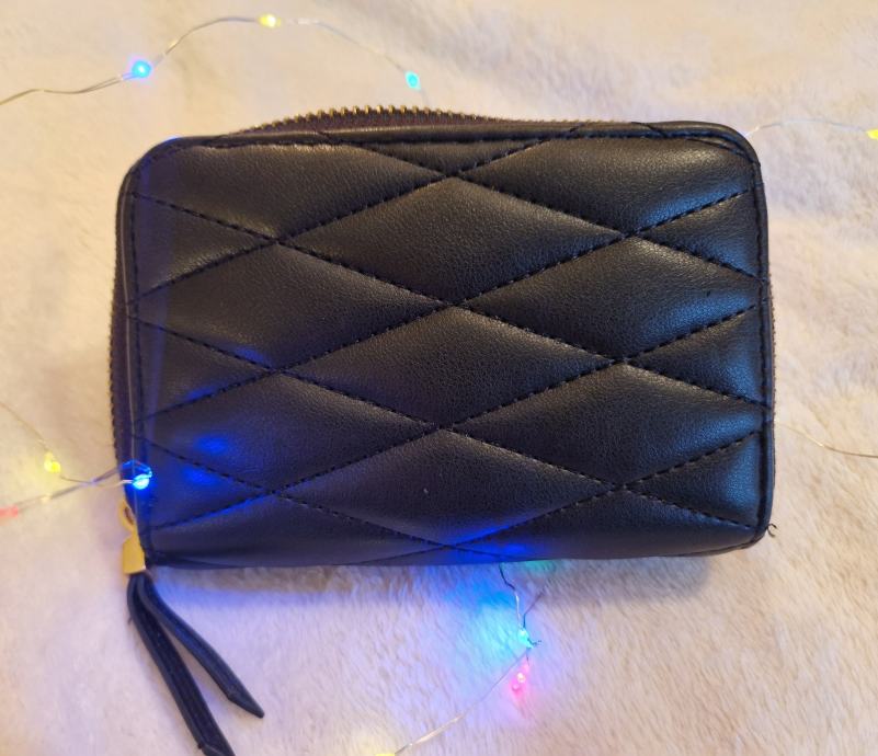 Elegantni Mango ženski novčanik u crnoj boji s prepoznatljivim prošivenim uzorkom rombova i zlatnim MNG logom. Novčanik je nov bez etikete, nekorišten. Ima prostrani unutarnji dio s više pretinaca i zlatnim zatvaračem. Praktičan je za svakodnevnu upotrebu s dovoljno mjesta za kartice i gotovinu.