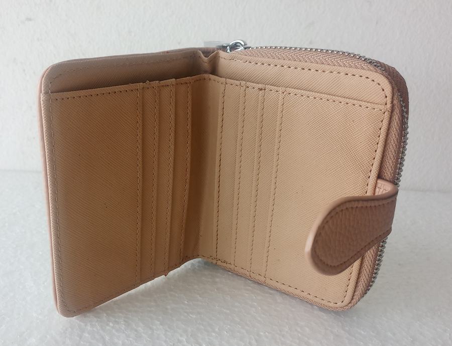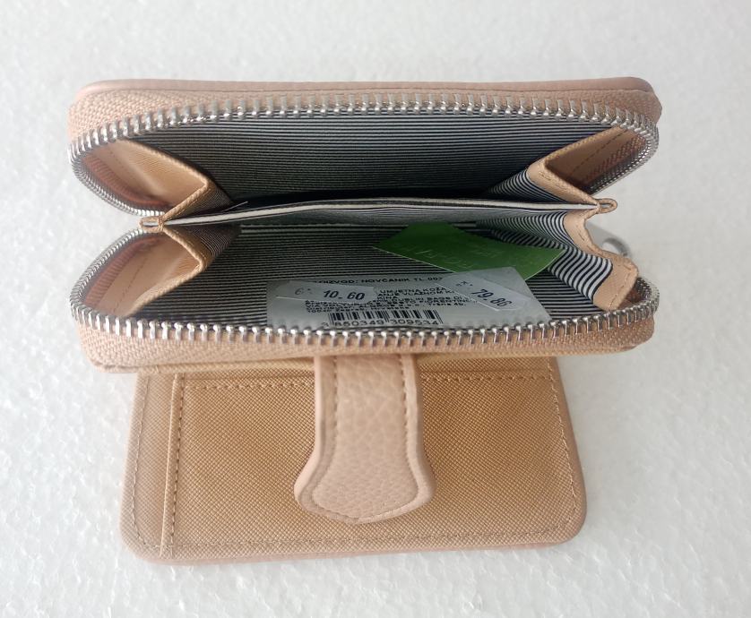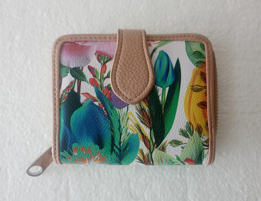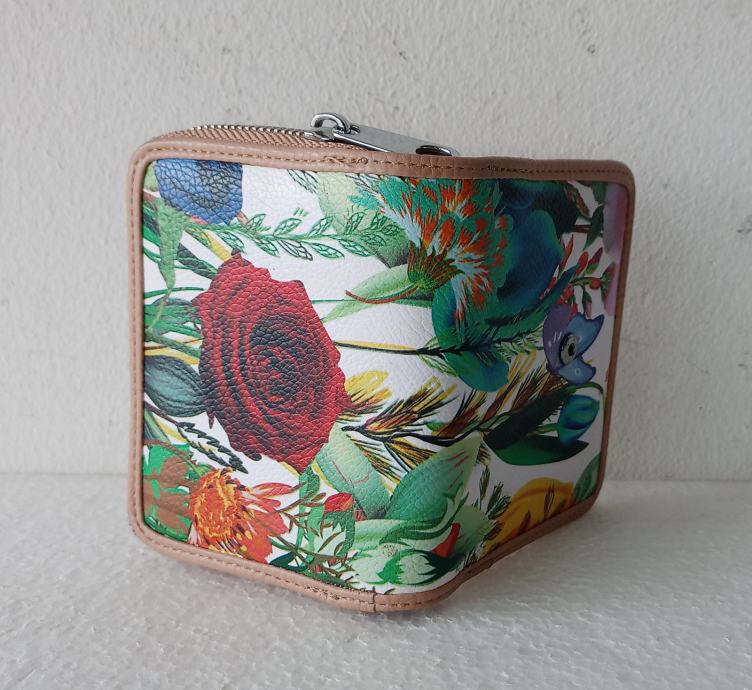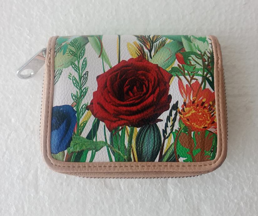 Novčanik sa cvjetnim motivom. Dvostrani, s jedne strane zatvoren zatvaračem i unutra dva pretinca. Druga strana za kartice i papirne novčanice.