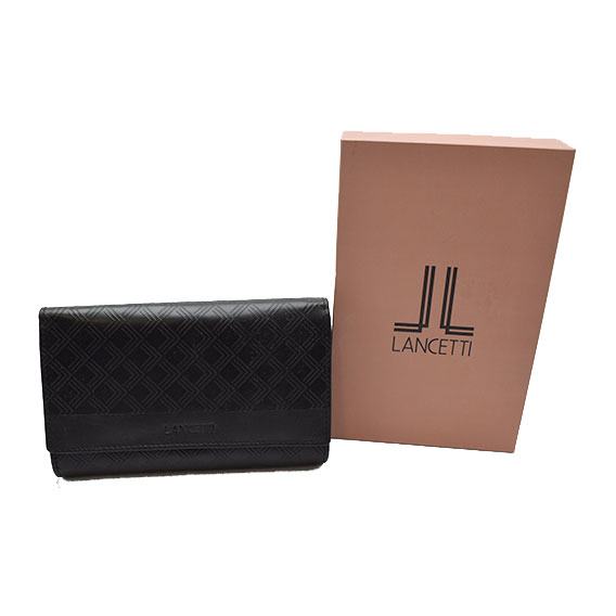 Kvalitetan kožni ženski novčanik modne kuće "Lancetti". Dimenzije novčanika (sklopljenog) 17.5 x 10.5 cm. Novčanik posjeduje jedan veliki pretinac za papirnati novac s dvije pregrade, jedan džep za sitan novac sa dvije pregrade koji se zatvara pomoću patentnog zatvarača i dva velika džepa dimezija 16.5 x 7.5 cm za dokumente. Novčanik sa vanjske strane ima preklop sa dva velika džepa za dokumente dimenzija 16.5 x 7.5 centimetara, te sedam pretinaca za kartice ili slične dokumente i jedan providni mrežasti džep dimezija 7.5 10.5 cm. Novčanik je izrađen od prirodne kože te posjeduje RFID zaštitu (tj. zaštitu protiv beskontaktnog skidanja novca sa kreditnih i debitnih kartica). Dolazi zajedno sa prigodnom poklon kutijom.