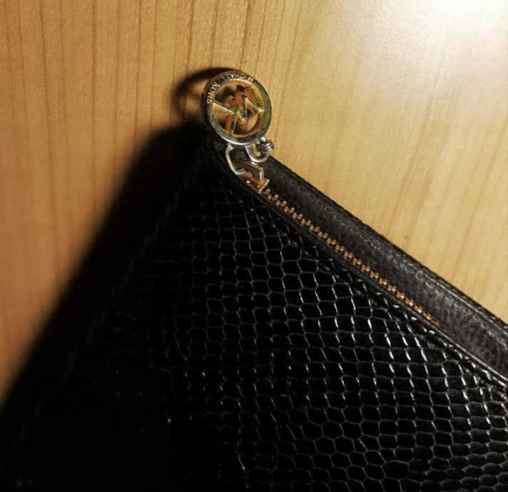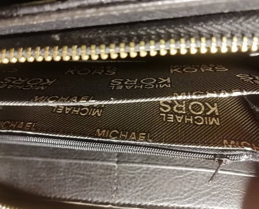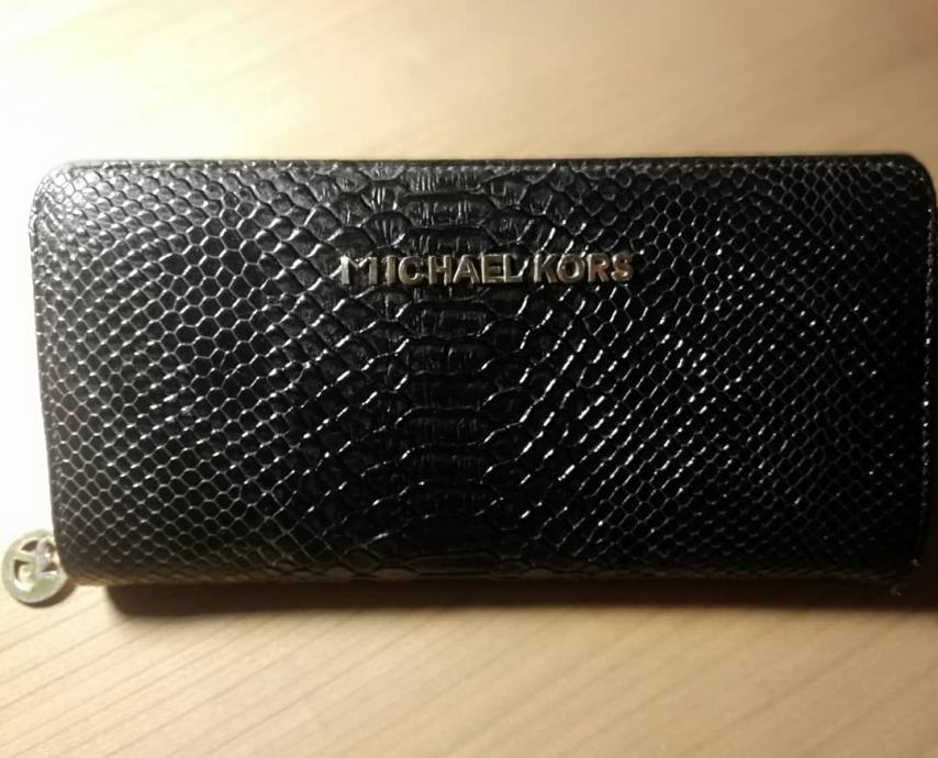 Michael Kors novčanik, ima oznaku na prednjoj strani i privjesak s natpisom Michael Kors i oznake u unutrašnjosti.
