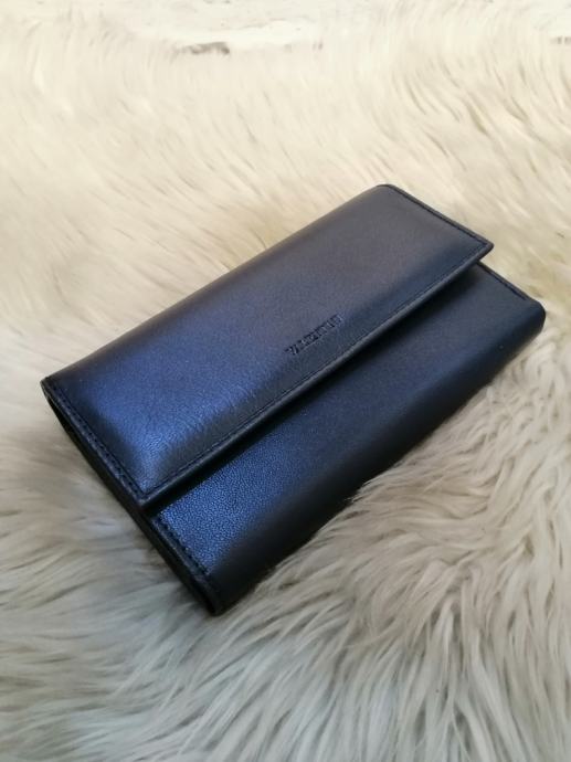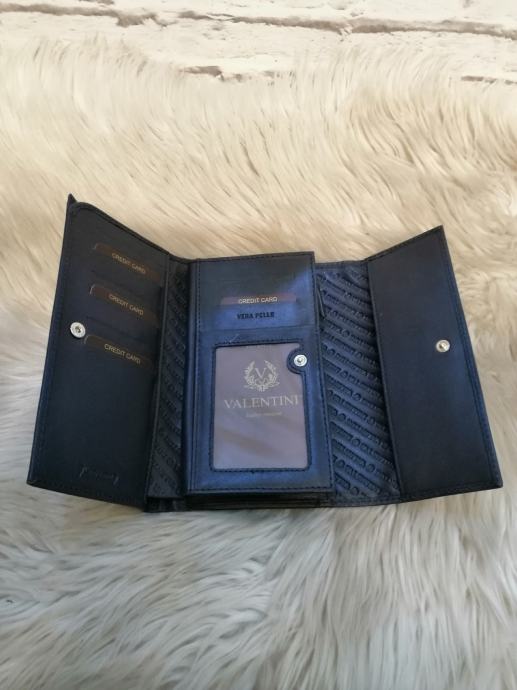 Novčanik se sastoji od 9 pretinaca za kartice,3 pretinca za novčanice,2 pretinca za dokumente, pretinca za kovanice,1 prozirni pretinca,sa stražnje strane novčanika nalazi se džep.