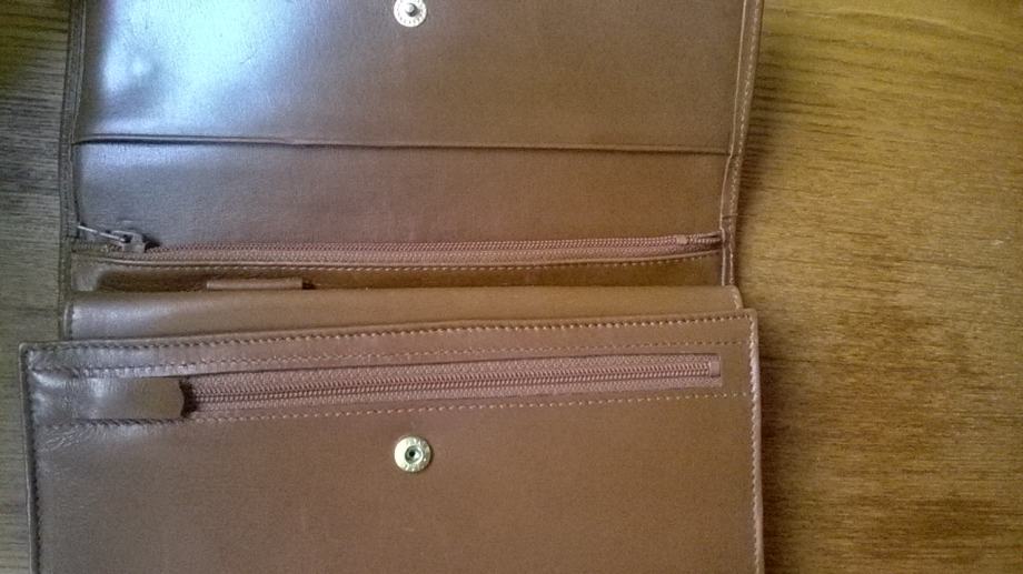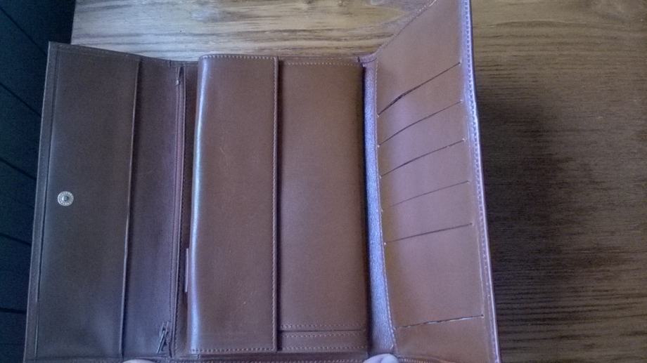 Potpuno novi, u original pakiranju reprezentativni novcanik od prave koze boje konjaka. Puno pretinaca. Vrhunska kvaliteta izrade sto se vidi na slikama. Dobiven na poklon a visak mi je. Dimenzije 20*13*2. Nema zamjene.