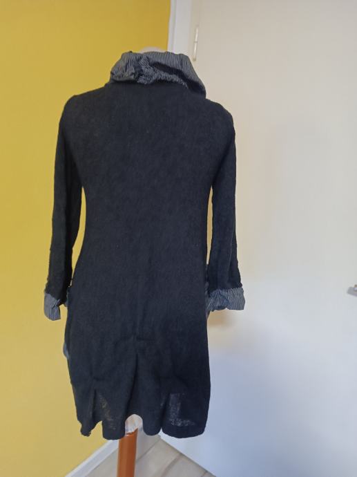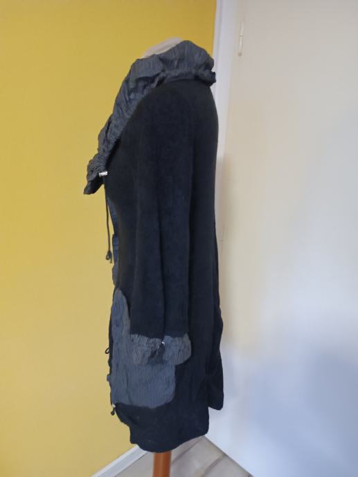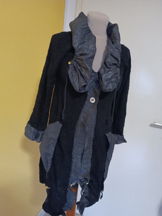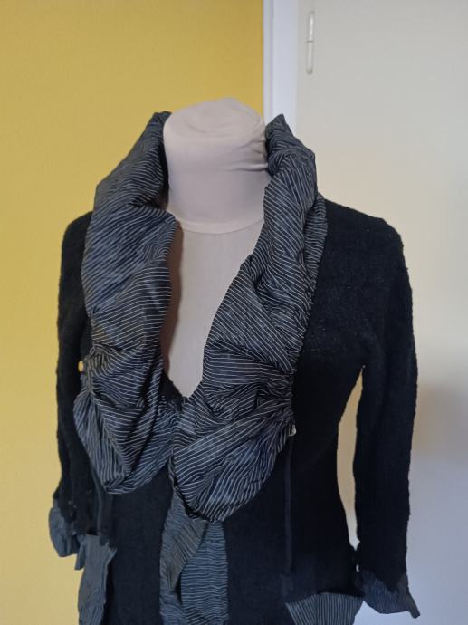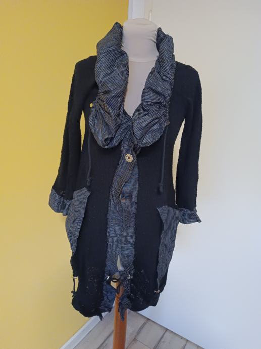 Vrlo lijepi i moderni kardigan, neobičnog, umjetničkog dizajna. Karakteriziraju ga veliki, naborani prugasti ovratnik i isti detalji na džepovima i manžetama. Izrađen od mješavine materijala. Kopča se s dva gumba. Ima dva džepa.