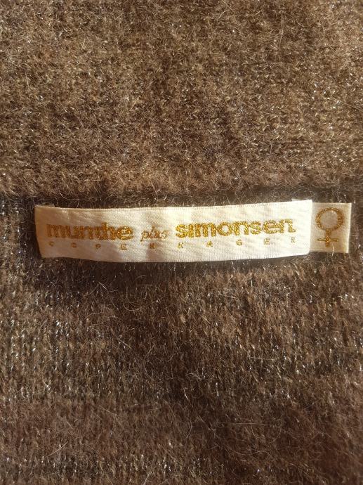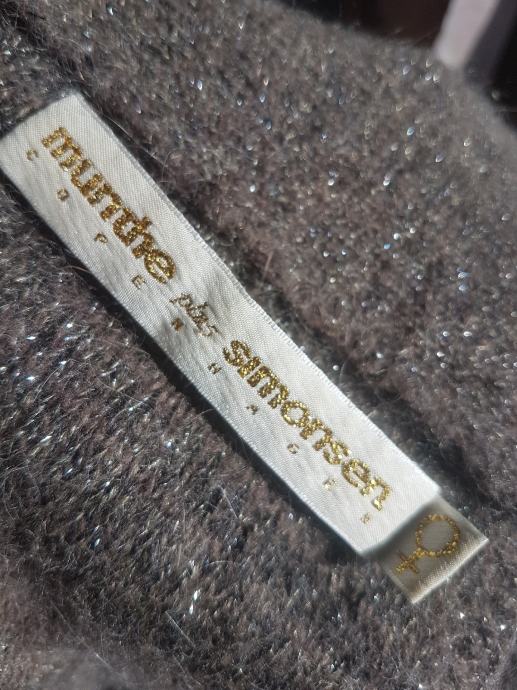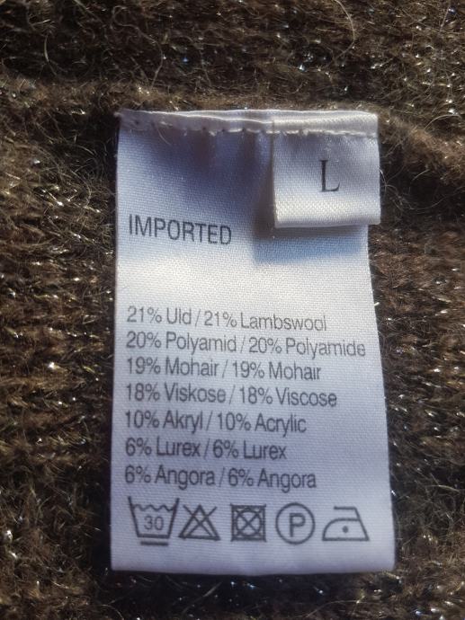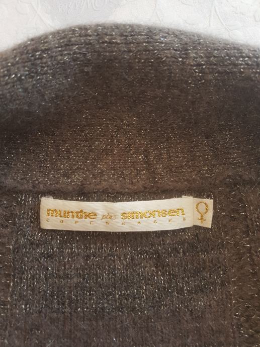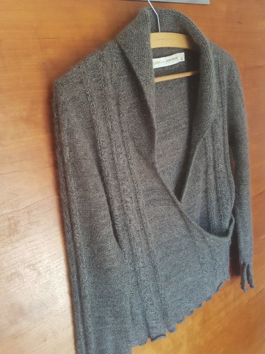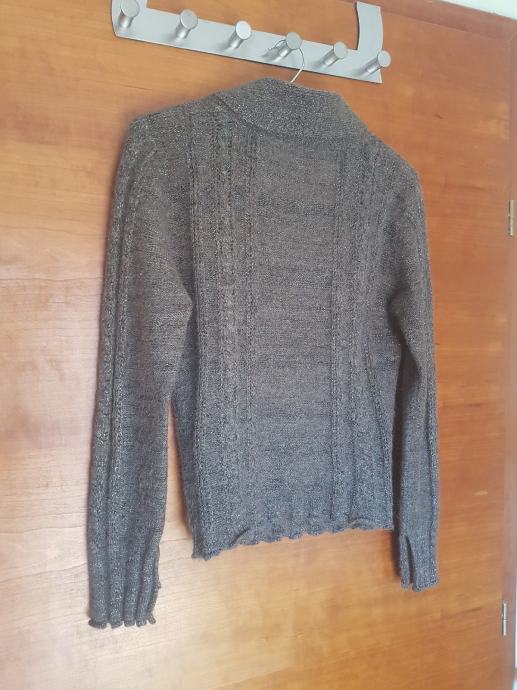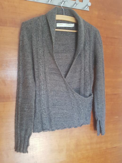 Pleteni džemper na preklop. Deklarirana kao L, po meni M - veći S. Dosta dugi rukavi. U sastavu: vuna, poliamid, moher, viskoza, akril, lurex, angora ( zadnja slika ). Boja taupe (sivo smeđa). U top stanju.