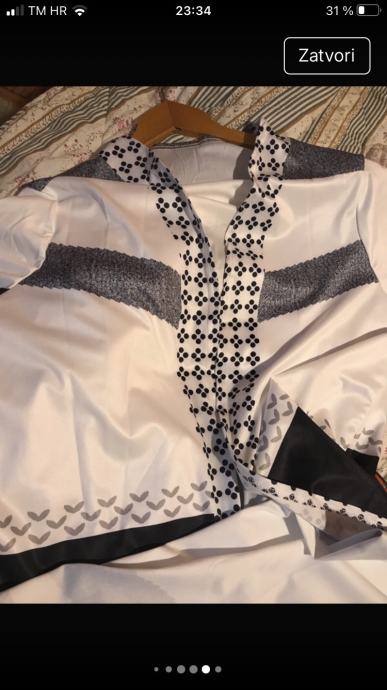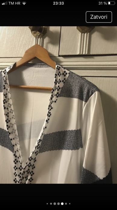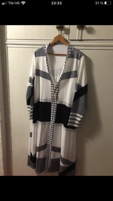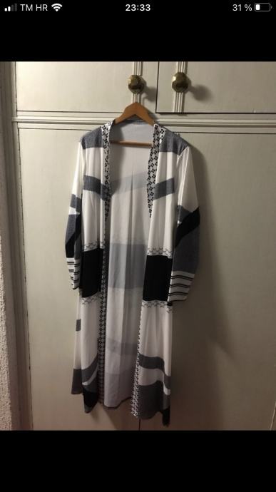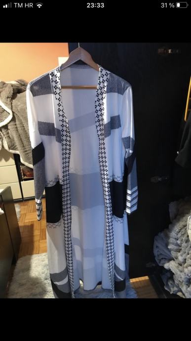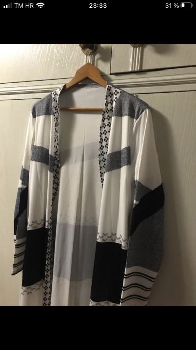 Prodajem crnikardigan veličine 46, s dugim rukavima i poliesterskim materijalom. Potpuno je nov samo bez etikete, idealan za svakodnevne kombinacije./crno bijelo/ sivi - boja
