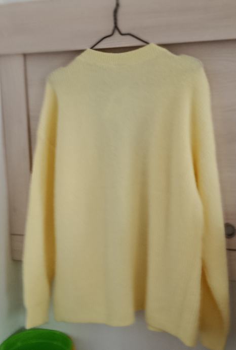 Novi ženski kardigan opuštenog kroja prekrasne pastelno žute boje. Veličina L. Kardigan je pletene strukture (fino, elastičo pletivo od mješavine materijala) otvorenog kroja s prednjim džepovima, dugim rukavima i spuštene je linije ramena. Iako je deklarirano L, a također i zbog elastične strukture pletiva, rekla bih da može odgovarati i većim veličinama.
