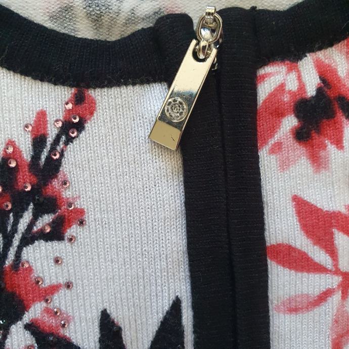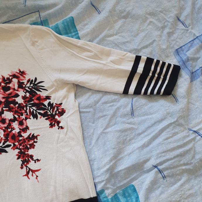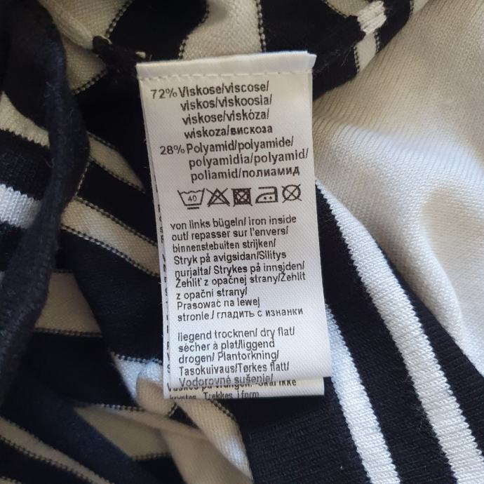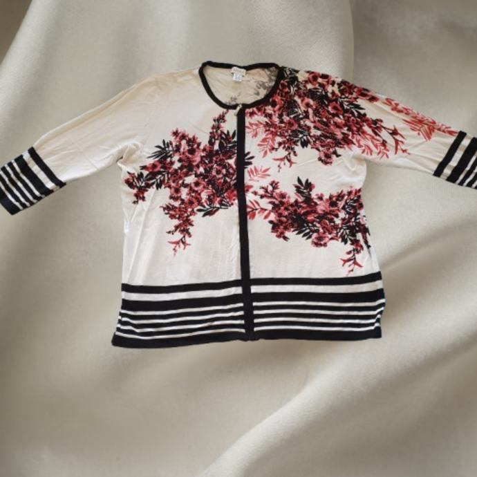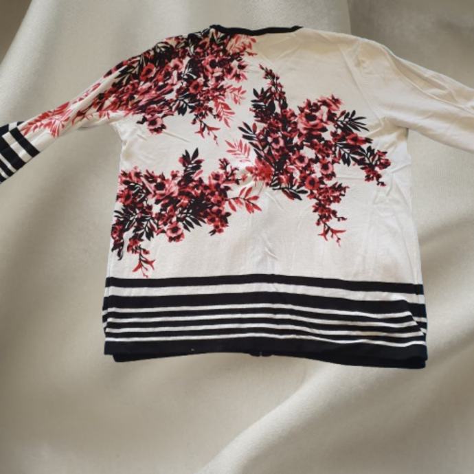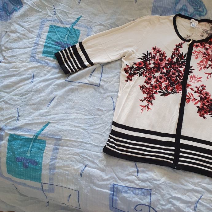 Mona vesta 46 odgovara 44. Materijal je mekan i da se rastezati. Mjere su ramena 42 cm, prsa 54 cm, rukavi 46 cm, dužina 69 cm. Sastav je 72 % viskoza 28 % poliamid.