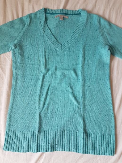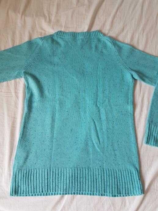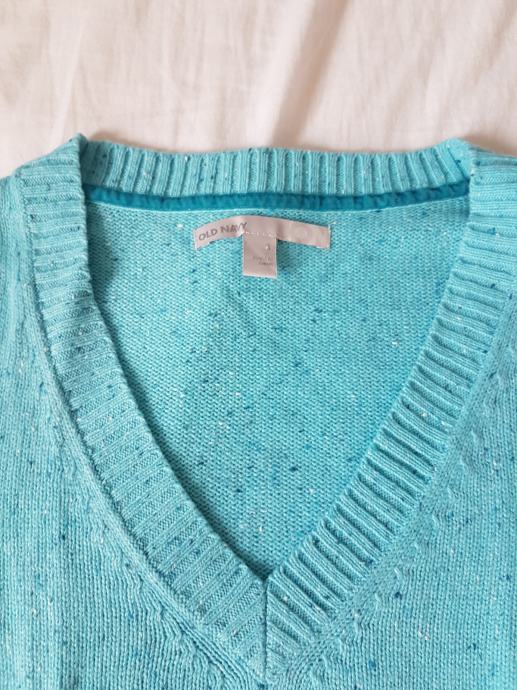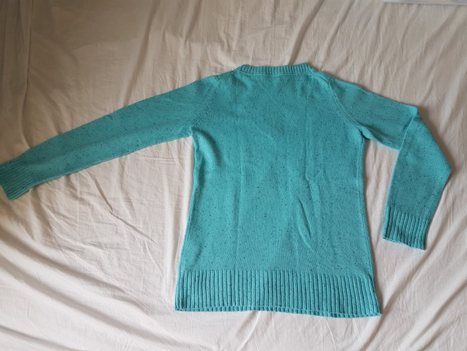 Old Navy džemper, srednje debljine, topao. Svijeloplave boje, tirkizne. Ima malu zakrpu na leđima iste boje kao i ostatak pulovera, te se jedva primjeti iz blizine, iz daljine se ni ne vidi (na slikama se ne vidi). Ostalo je sve očuvano. Deklarirana veličina S, no mislim da je je više M (38).