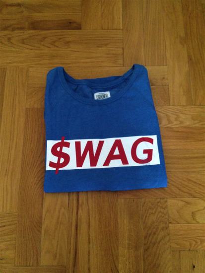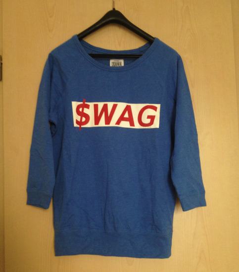 Nošen ali uščuvan plavi pulover sa natpisom SWAG, bez ikakvih oštećenja.