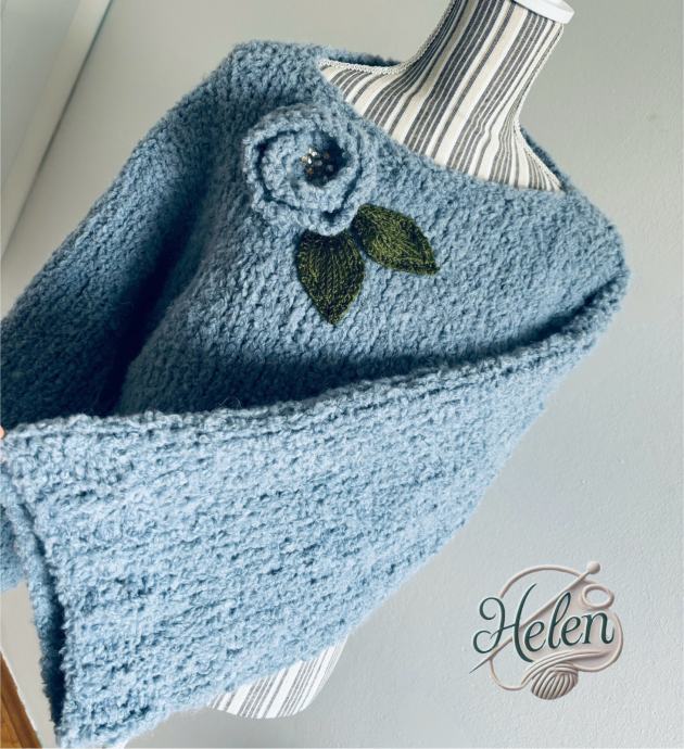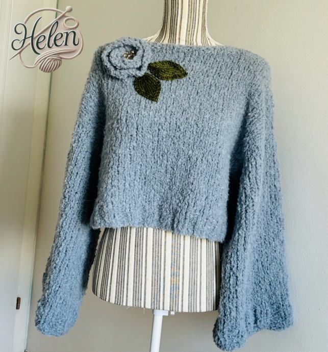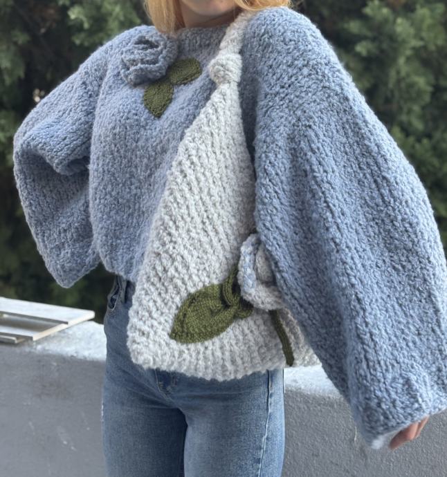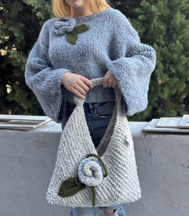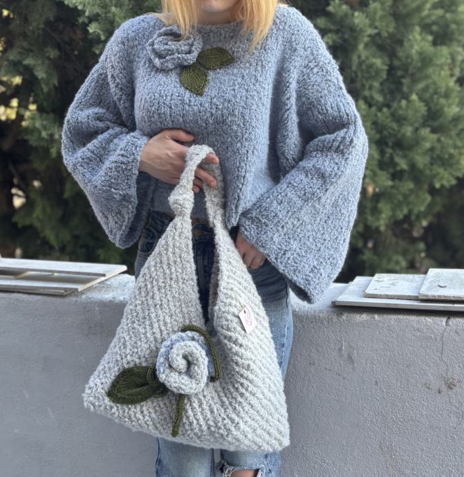 Napravljen od kvalitetnoj vuni , ukrašen pletenom ružom , uz pulover ide torbica koja je u cijeni .