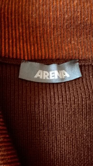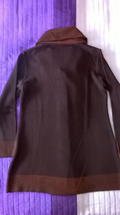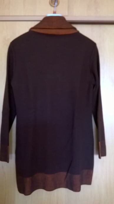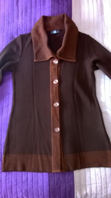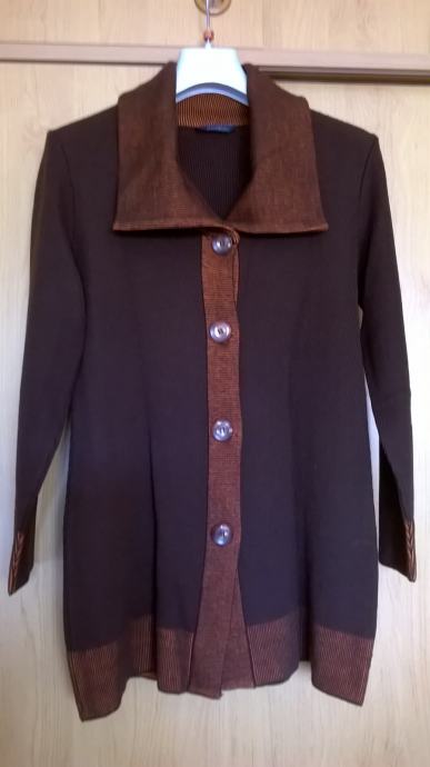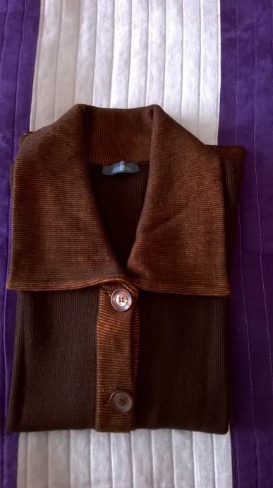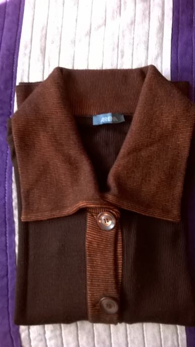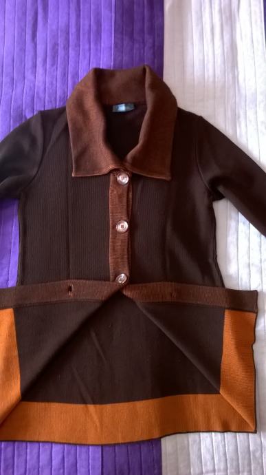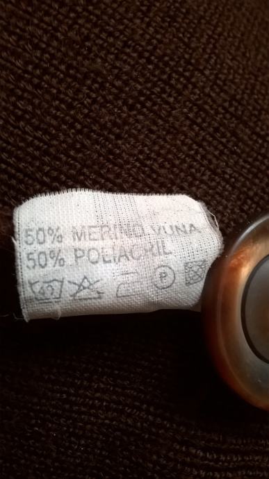 Vesta je smeđa sa narančastim detaljima. Sastav: 50% vuna, 50% polyester.