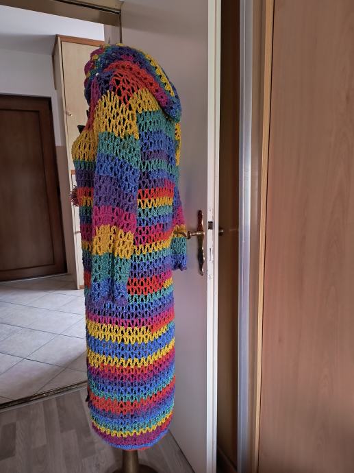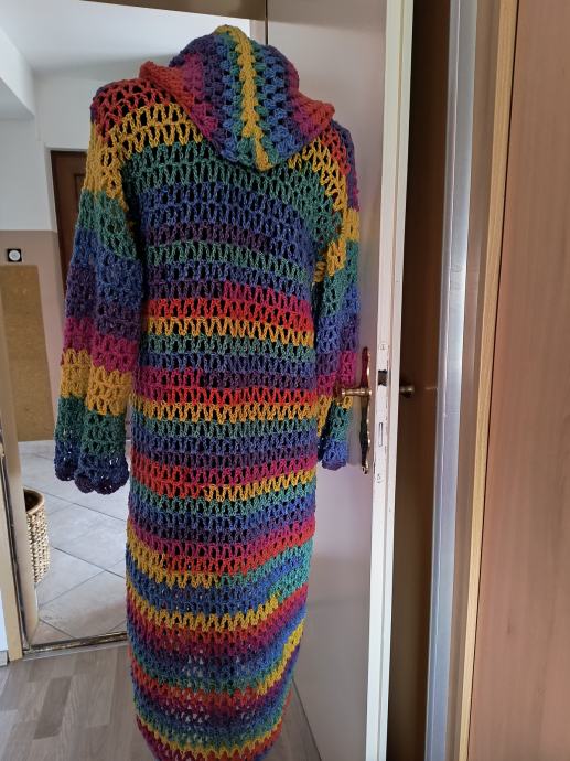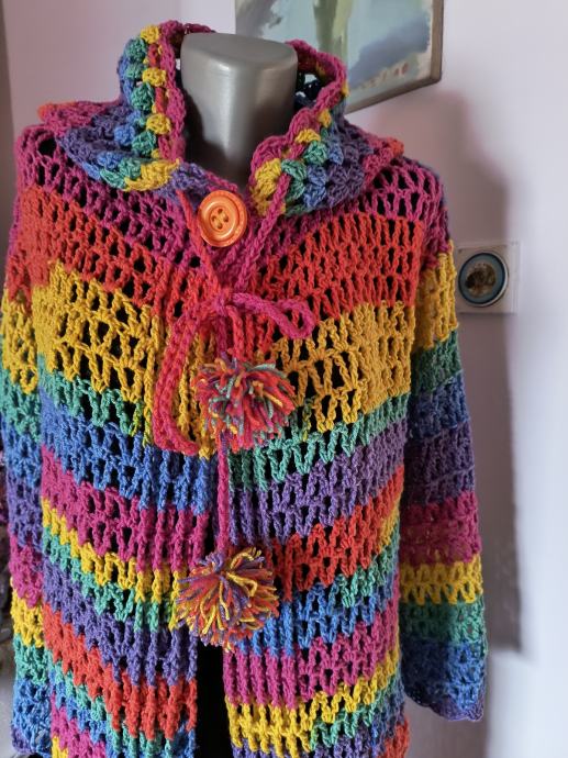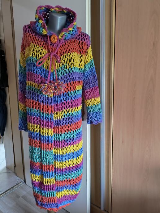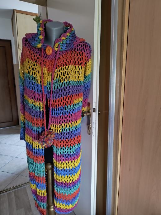Predivna duga vesta sa kapuljačom ručno heklana, veličina od 38 do 44, prilagodljivo figuri tijela.