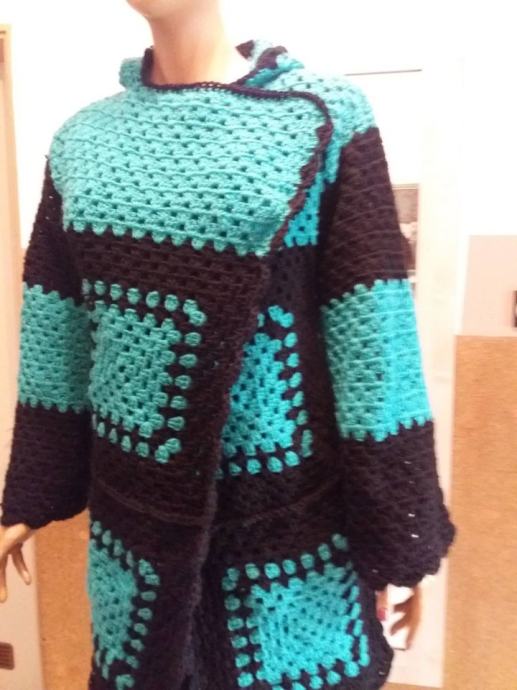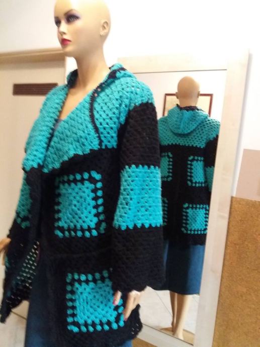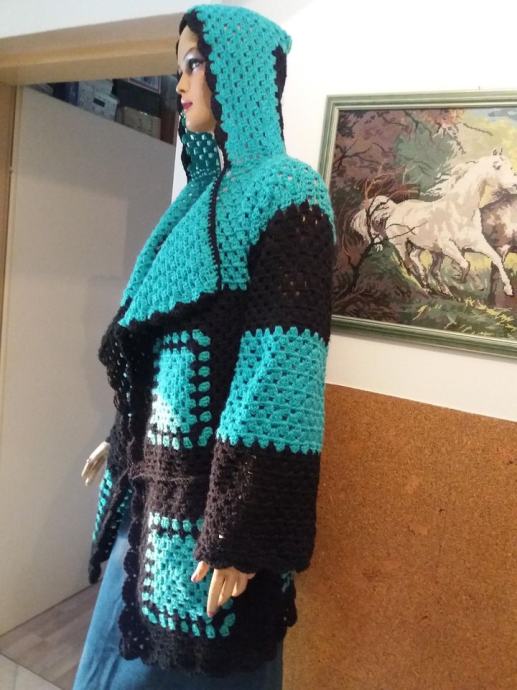 Crno, zelena vesta sa kapuljačom na preklop, udobna, lagana i topla.