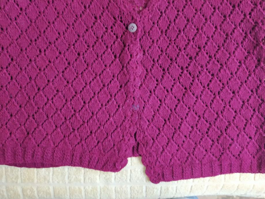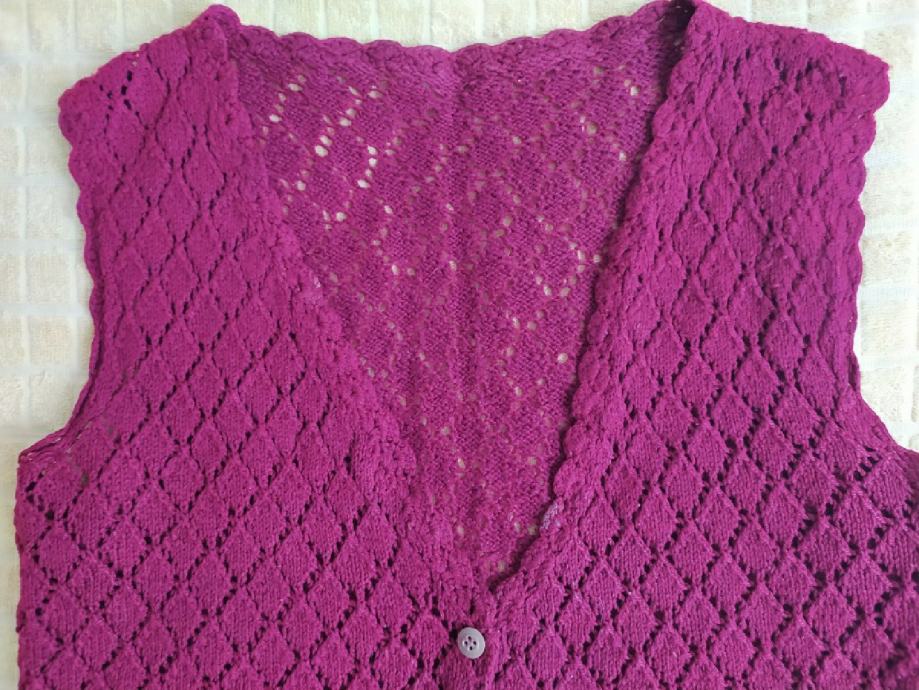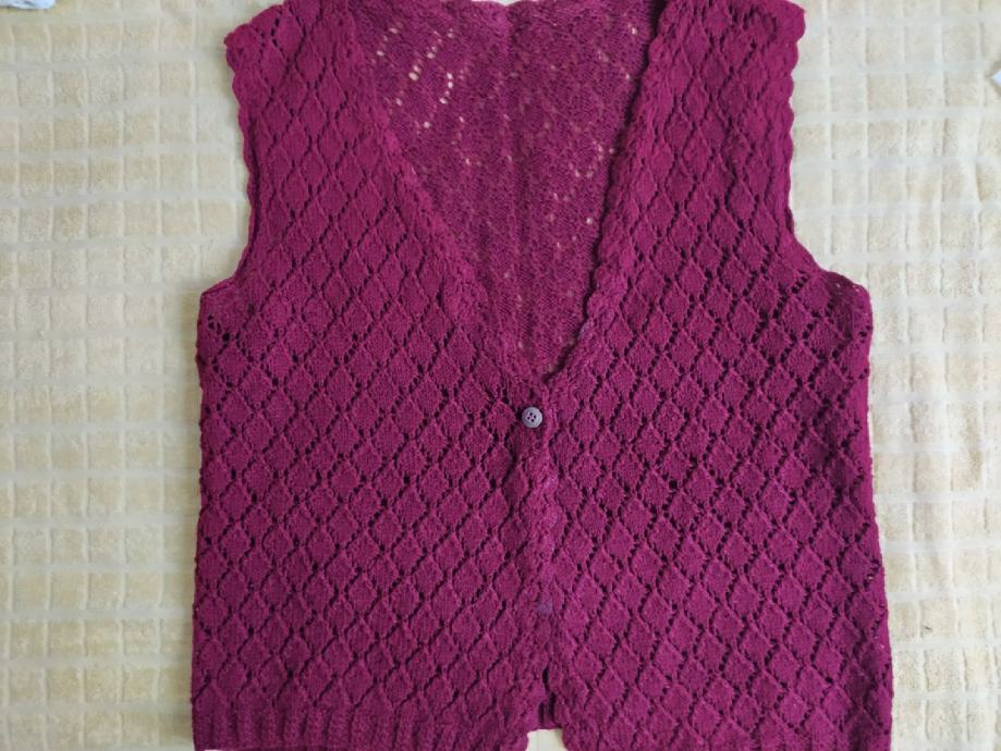 Vesta ženska bezrukavnik "Bordo crvena" vel L. Na gumbe, Bordo crvena boja. Za nositi kao casual, svaki dan, posao,,,. Jedan jako lijepi ukrasni uzorak pletiva na prednjoj strani. Nije nikada nošena, stoji u ormaru. Oprano i čisto. Dužina 55cm, širina 49cm, ramena 42cm.