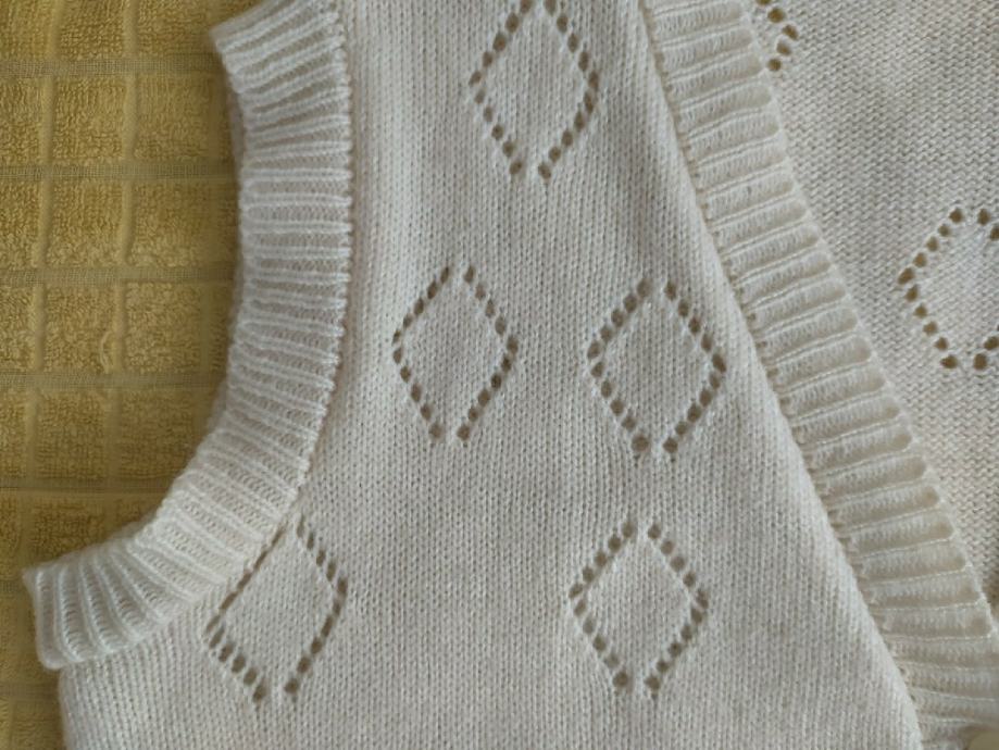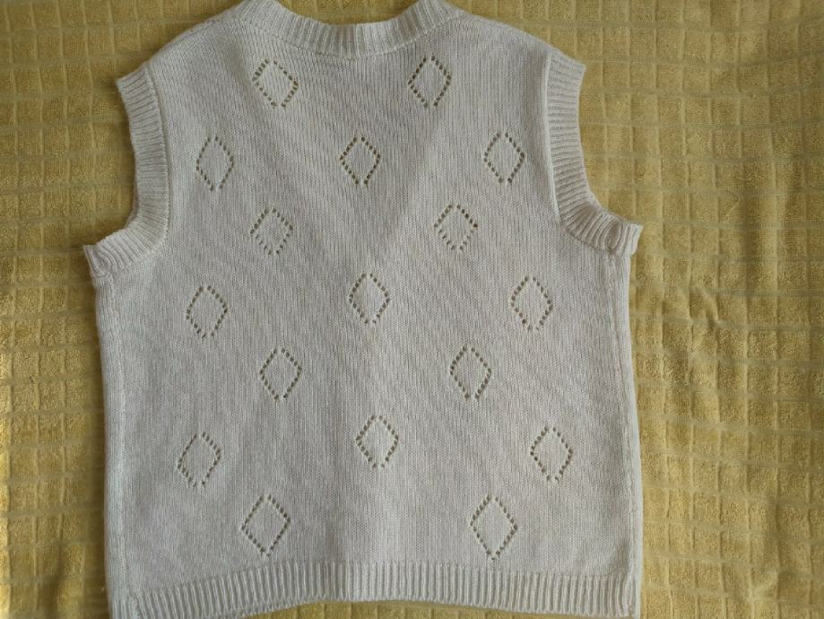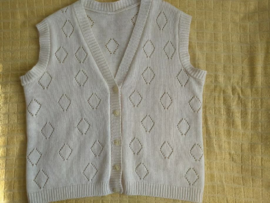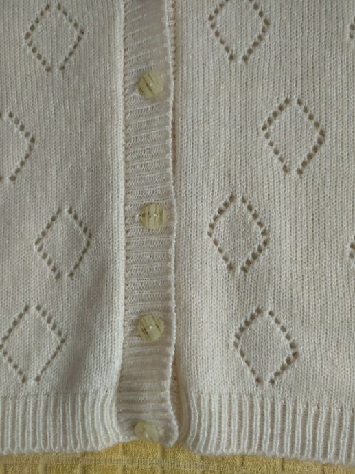 Vesta ženska bezrukavnik "Krem" vel L Na gumbe ,krem bijela boja. Za nositi kao casual, svaki dan, posao,,,. Jedan jako lijepi ukrasni uzorak pletiva na prednjoj strani. Nije nikada nošena, stoji u ormaru. Oprano i čisto. Dužina 62cm, širina 56cm, ramena 50cm.