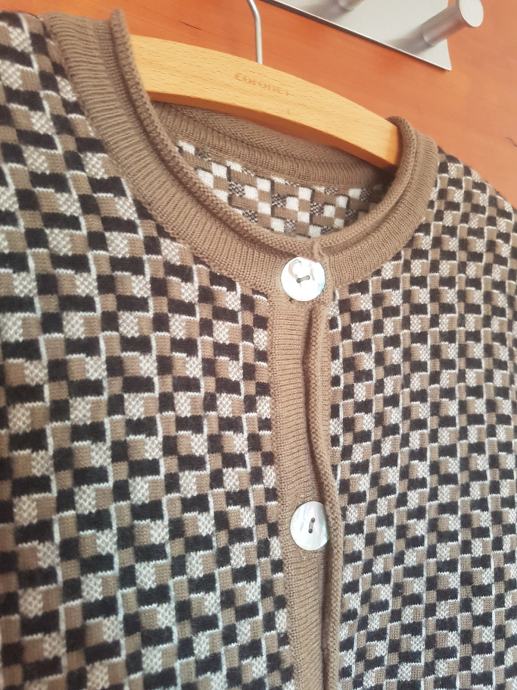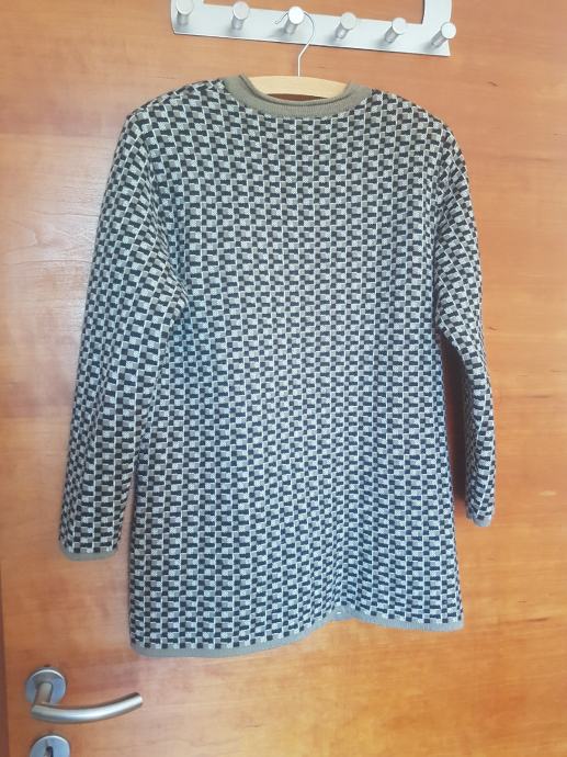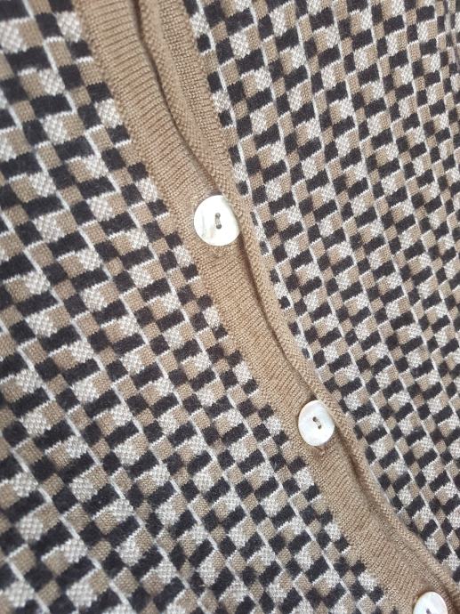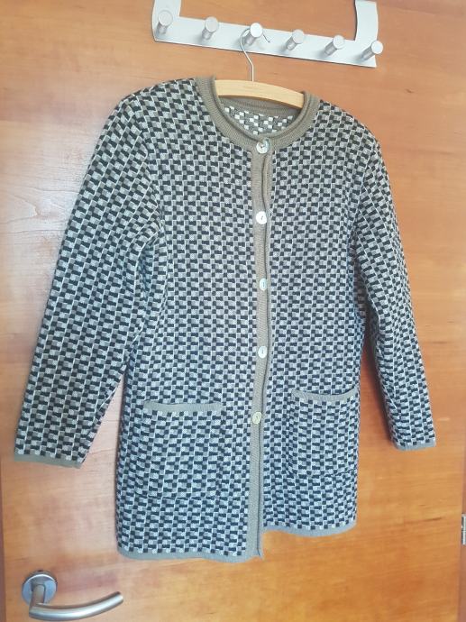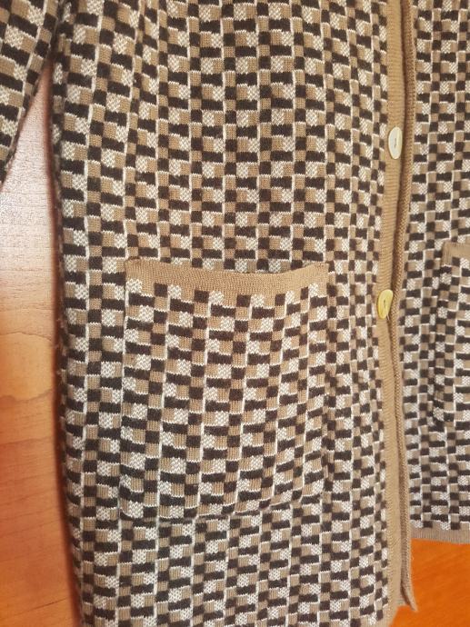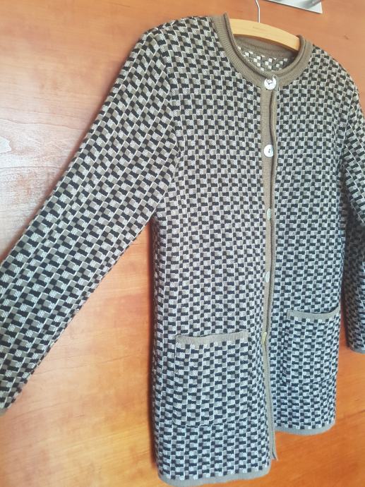 Vintage deblja vesta - kardigan, duga i topla, može kao kaputić-jaknica. U sastavu merino vuna. Ravni kroj, podstavljena ramena, dva džepa naprijed, sedefasti gumbi. Boje kockica: crna, bijela, maslinasta. Deklarirana kao M, po meni S-M.