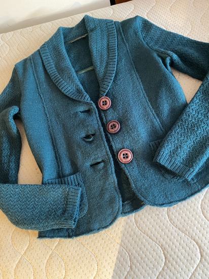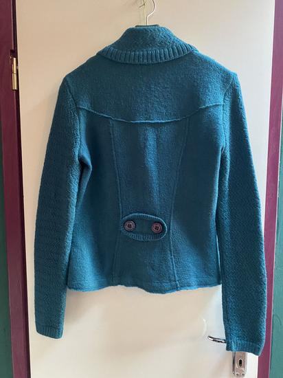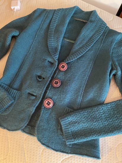Prekrasan boja zeleno tirkizna ne mogu ju baš uloviti fotičem. Prsa 49, ramena 39, dužina 60, rukavi 67cm. Deklariran je s no bez problema m odgovara. Skupi brand koštao 250€ 100% vuna . Opran i spreman za nošenje.