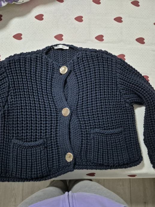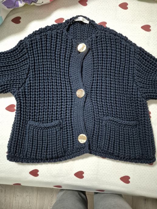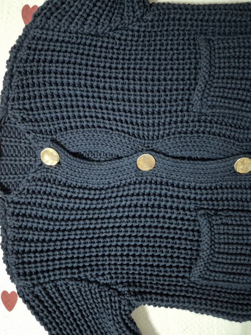 Prodajem Zara vestu u tamno plavoj boji, veličina L. Radi se o pletenom modelu grublje teksture s V-izrezom, trima velikim dekorativnim gumbima te dva prednja džepa. Stanje je kao novo.