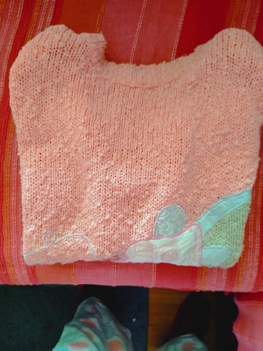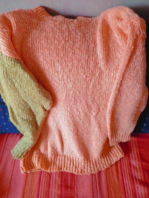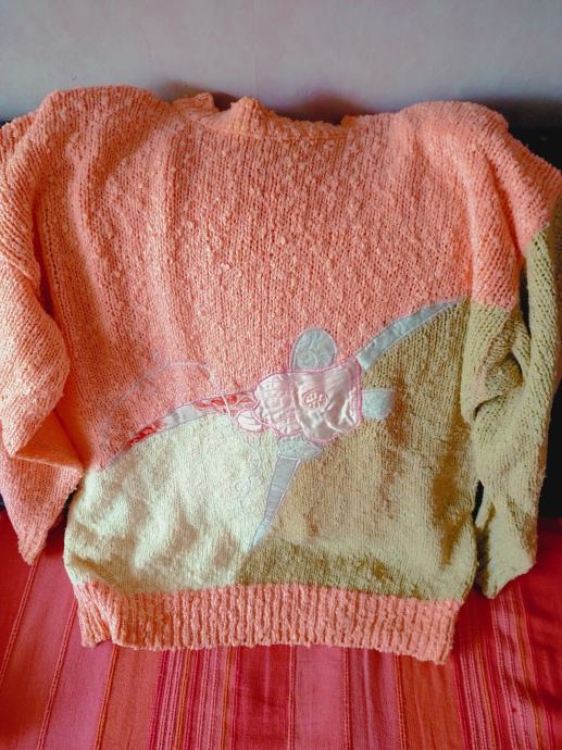 Lijep džemper sa svilenkastim ukrasom, nježne ružičaste boje, jedan rukav bež, u odličnom stanju, veličina 42